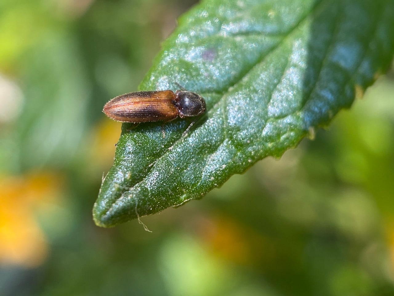 A tiny Click Beetle, Tetralimonius sp. (family Elateridae) is resting on a leaf of Sticky Monkeyflower.