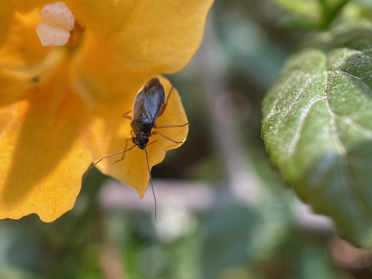 As the insect exits from the flower, I recognize it as a Black Grass Bug, Irbisia sp. (family Miridae).