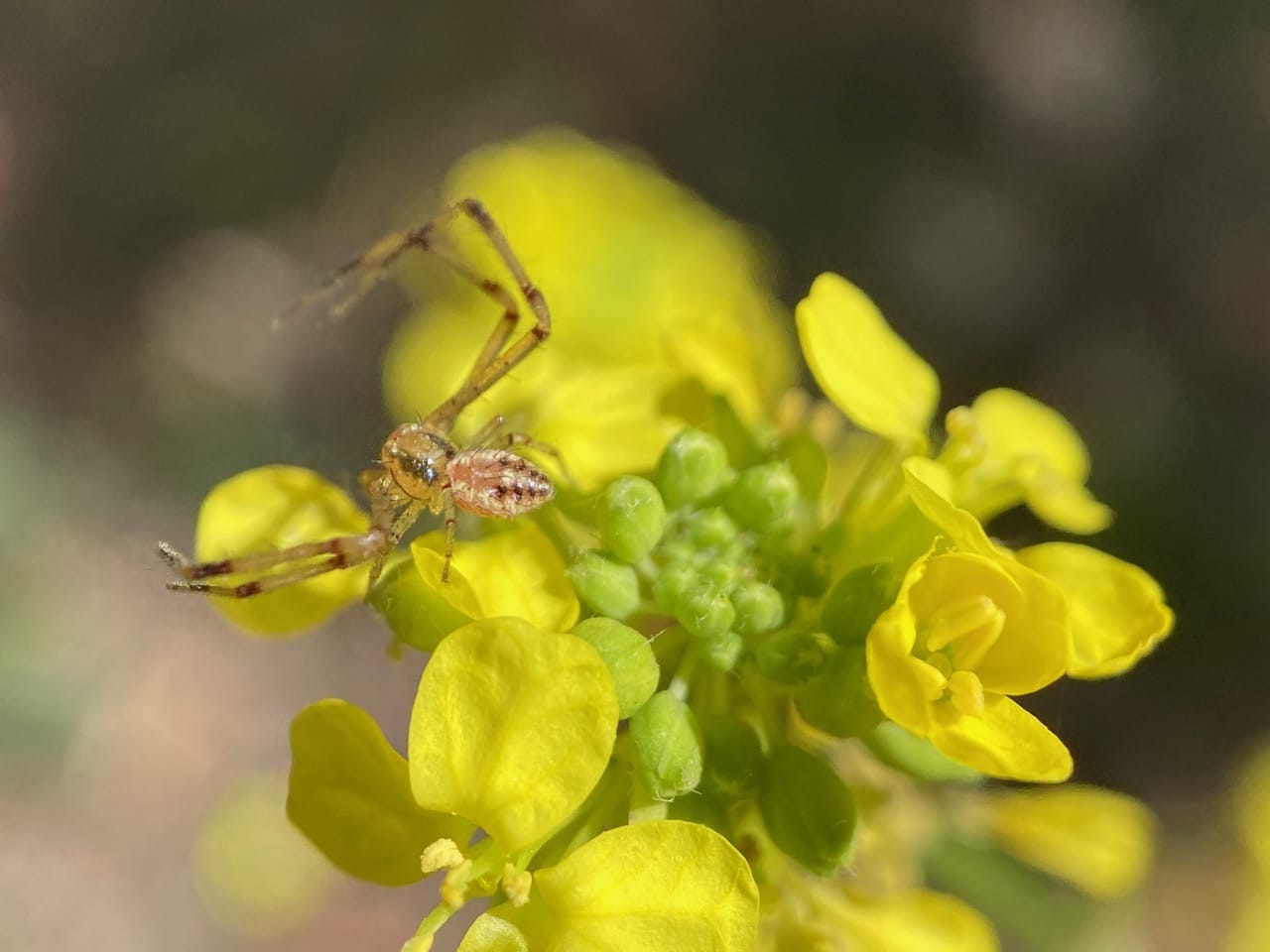 A male Swift Crab Spider, Mecaphesa celer (family Thomisidae) is waiting in ambush on a cluster of Wild Mustard flowers.
