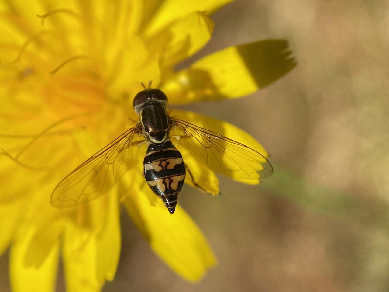 A female Western Calligrapher, Toxomerus occidentalis (family Syrphidae) lands on a Dandelion flowerhead to feed on pollen. The hover fly is small, but has the most easily recognizable pattern on their abdomen.