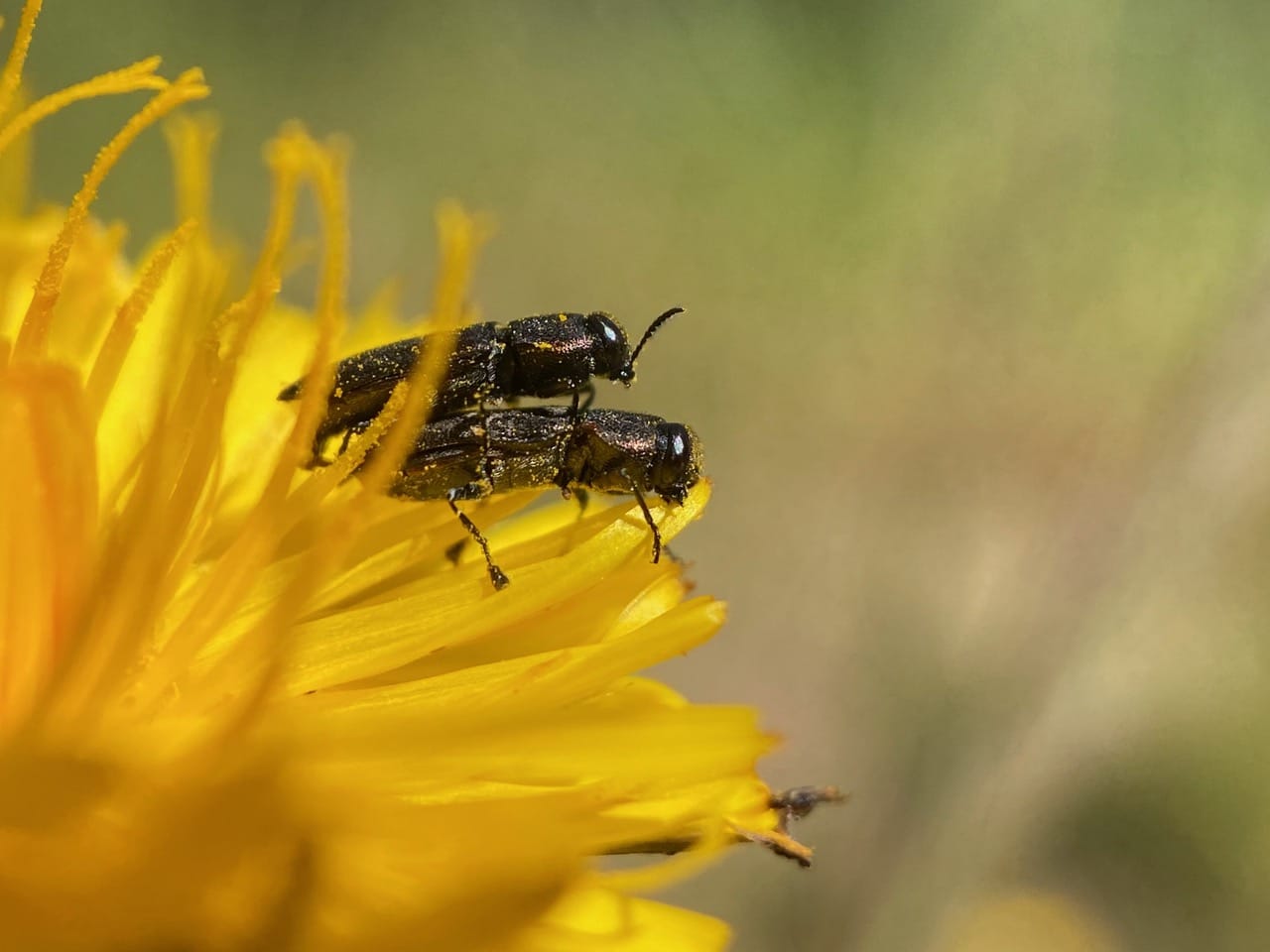 A pair of Buprestid Beetles are mating on a Dandelion flowerhead.