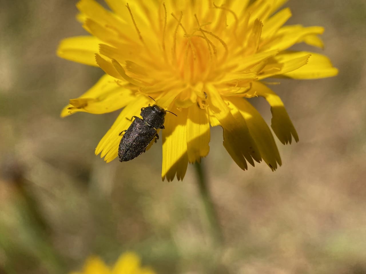 This Dandelion flowerhead is ravaged by multiple Buprestid Beetles (family Buprestidae).