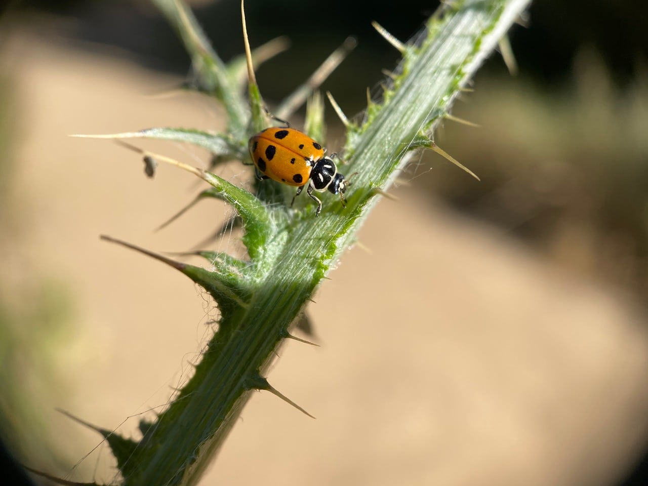 A Convergent Ladybeetle, Hippodamia convergens (family Coccinelidae) another aphid predator, is hunting on an Italian Thistle. Both adult and larval ladybeetles feed on aphids.