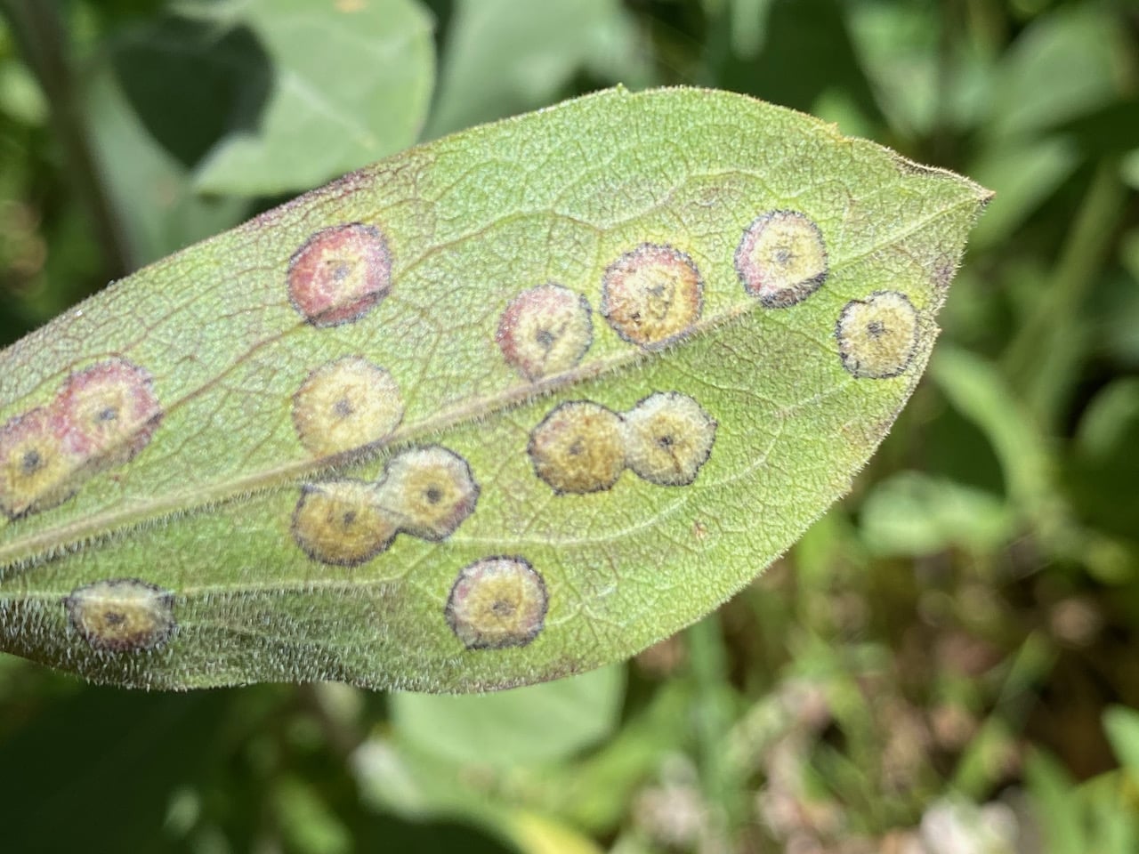 It’s a well-known goldenrod gall, induced by the gall midge Asteromyia carbonifera (family Cecidomyiidae). The midge induces flat, circular galls in the leaves of various goldenrods (Solidago). One to ten or more larvae develop in each gall. Color and size of the gall vary by host species and number of larvae. The galls contain a symbiotic fungus, Botryosphaeria dothidea, which the larva apparently does not eat. The fungus seems to confer some protection against parasitoid wasps. Females carry spores of the fungus.