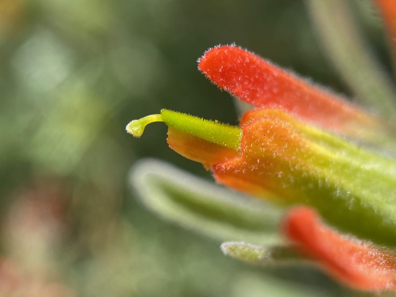 The knobby structure hanging out of the floral tube is an immature bilobed stigma. The stamens are located just behind the entrance of the floral tube.