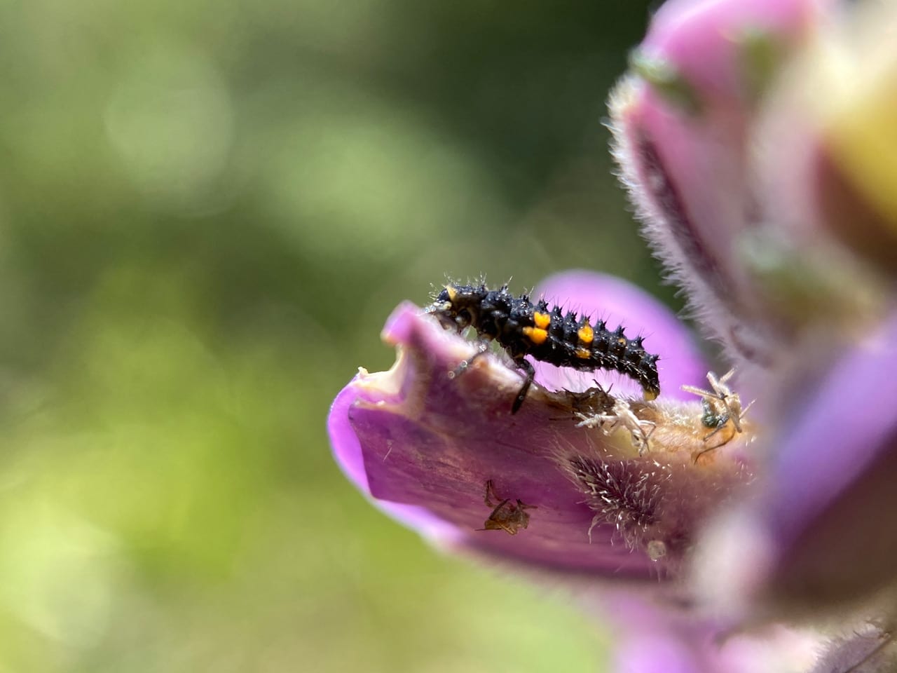 A younger Ladybeetle larva is feeding on an aphid on a flower of Silverleaf Lupine.