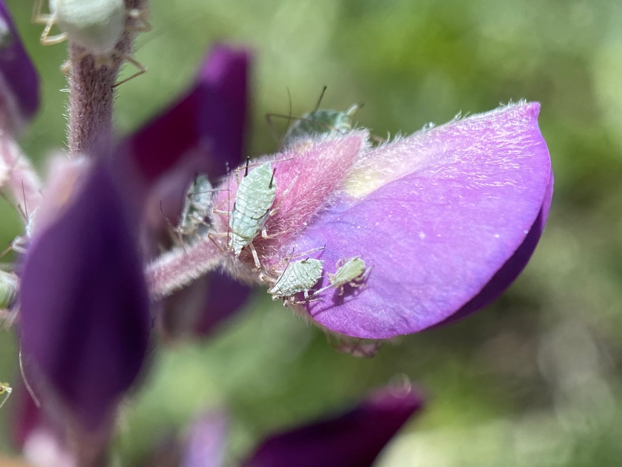 At Diablo Bend, I check on the Lupin Aphids on the infested Silverleaf Lupine, Lupinus albifrons. Yes, they are still there, in many sizes and ages, on the fresh flowers…