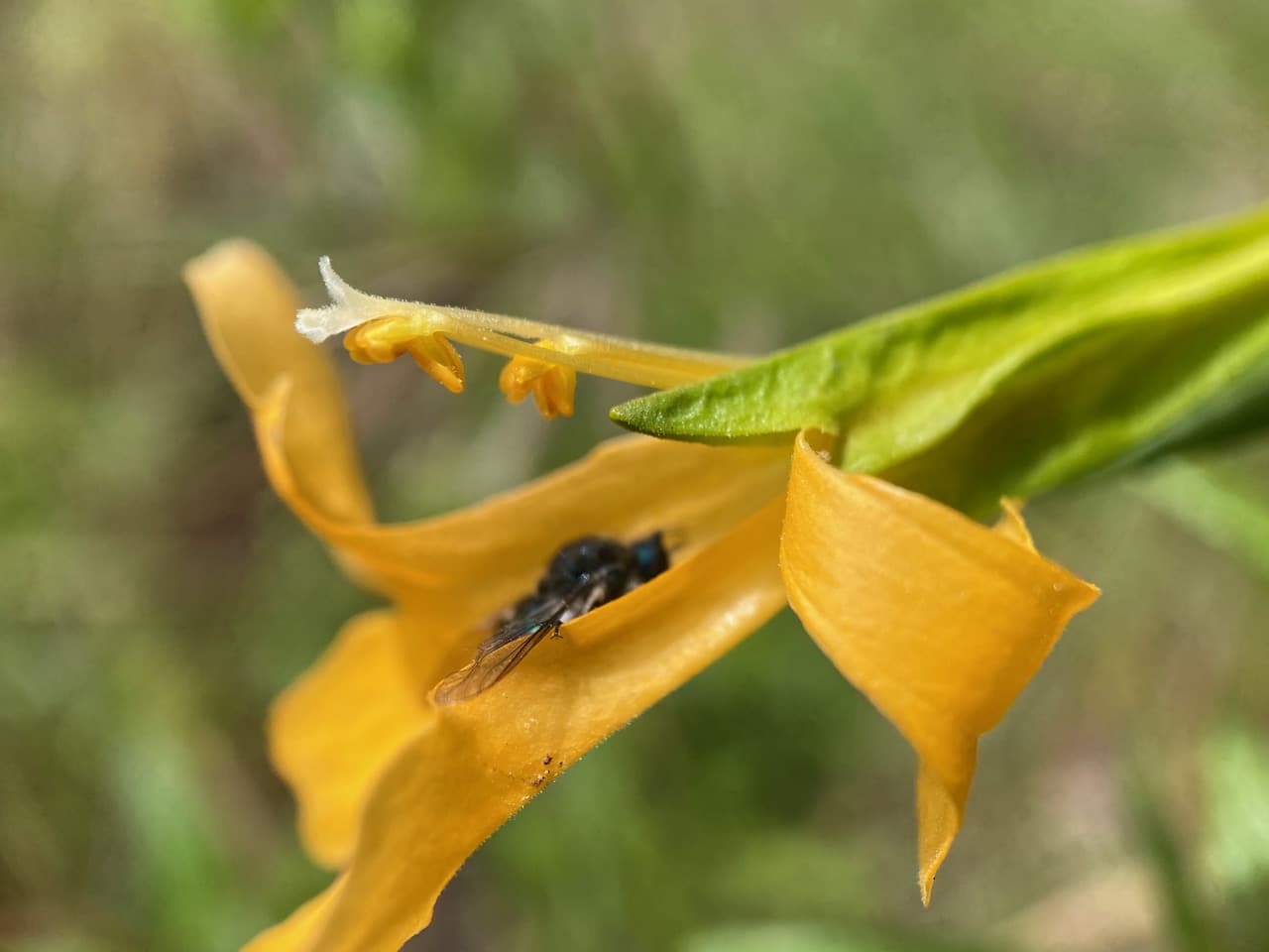 My acquaintance with this fly goes back a few years when I was a volunteer at the Bridgeview Pollinator Garden in Oakland. Each year I would watch the flies appear on the Sticky Monkeyflower, Diplacus aurantiacus just as the plant begins to bloom in May. In the early morning, the flies would be safely tucked within the floral tubes, with only their shiny butts visible. As the sun begins to warm up the air, the flies would wake up, move outside the flowers to bask and groom themselves. Often their backs are covered with pollen if the stamens on the roof of their chosen overnight shelter were dispensing a golden shower while they snoozed.