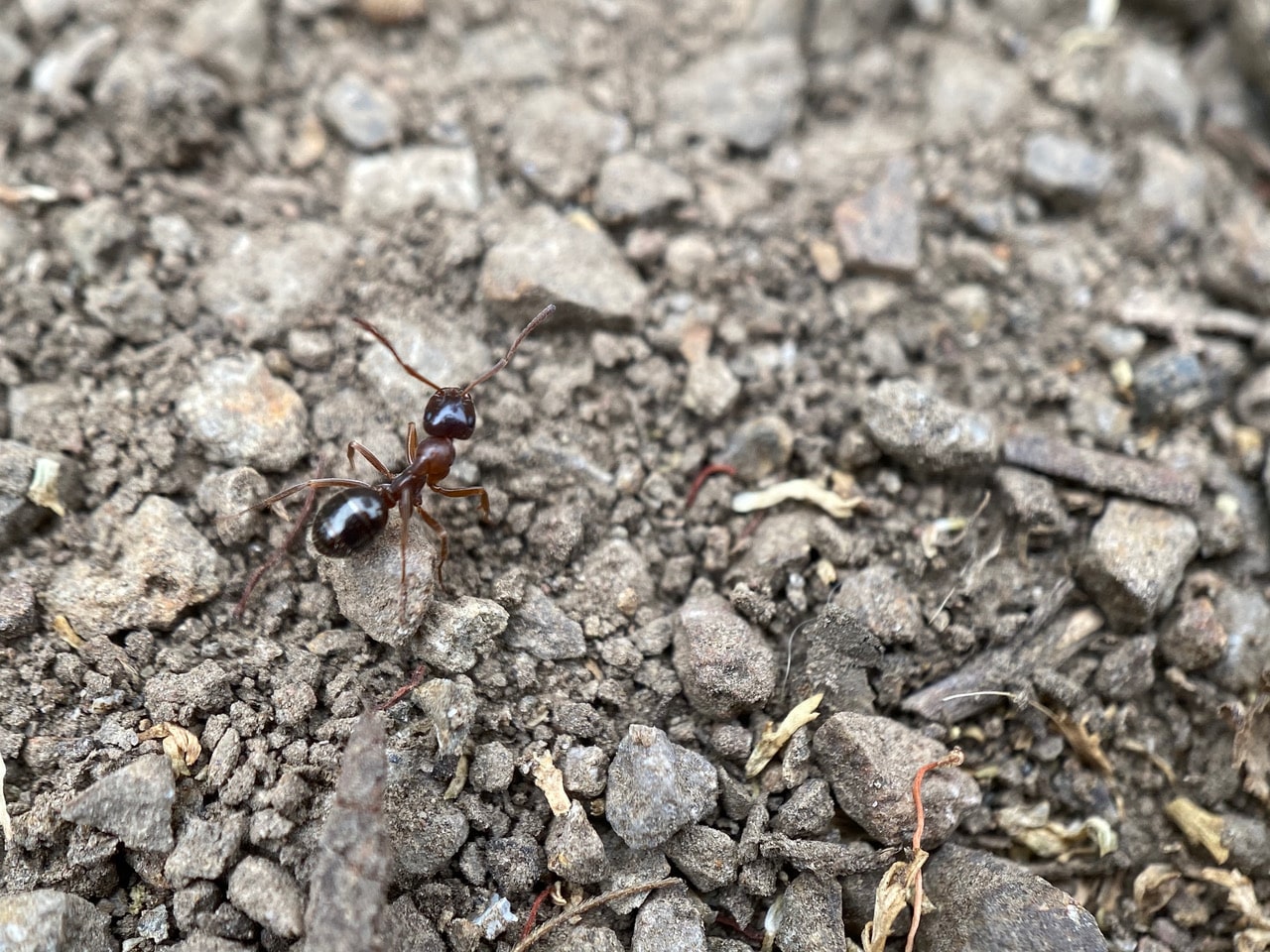 A Field Ant, Formica subpolita (family Formicidae) is foraging on the trail.