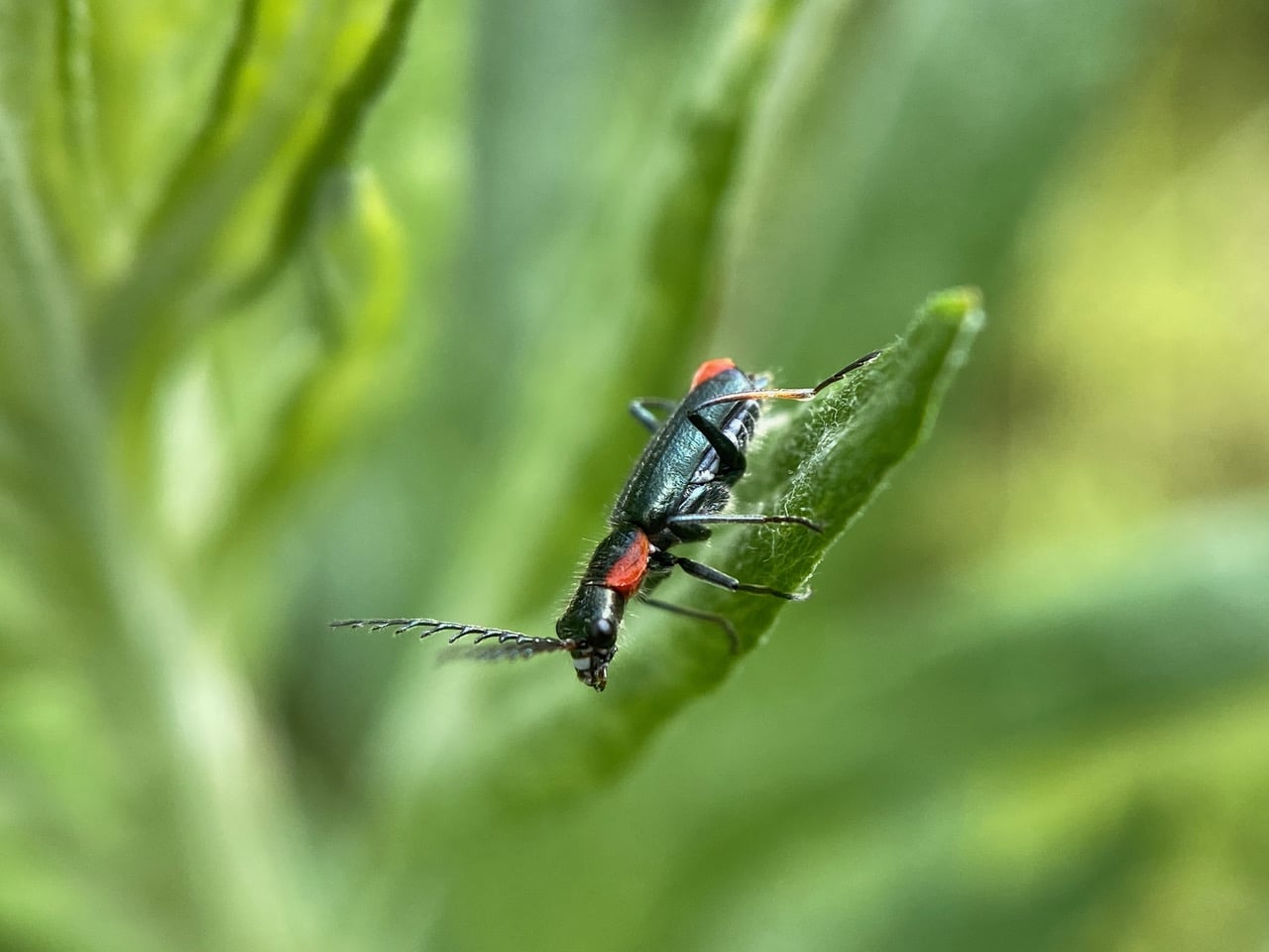 A Malachite Beetle, Malachius sp. (family Melyridae, subfamily Malachiinae) strikes a pretty pose on a Mugwort leaf.