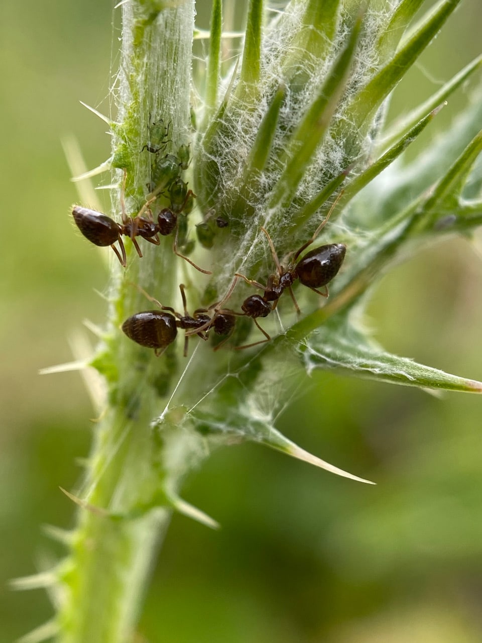 Some American Winter Ants, Prenolepis imparis are tending Thistle Aphids, Brachycaudus cardui on an Italian Thistle. These ants are in their elements in this cold weather.