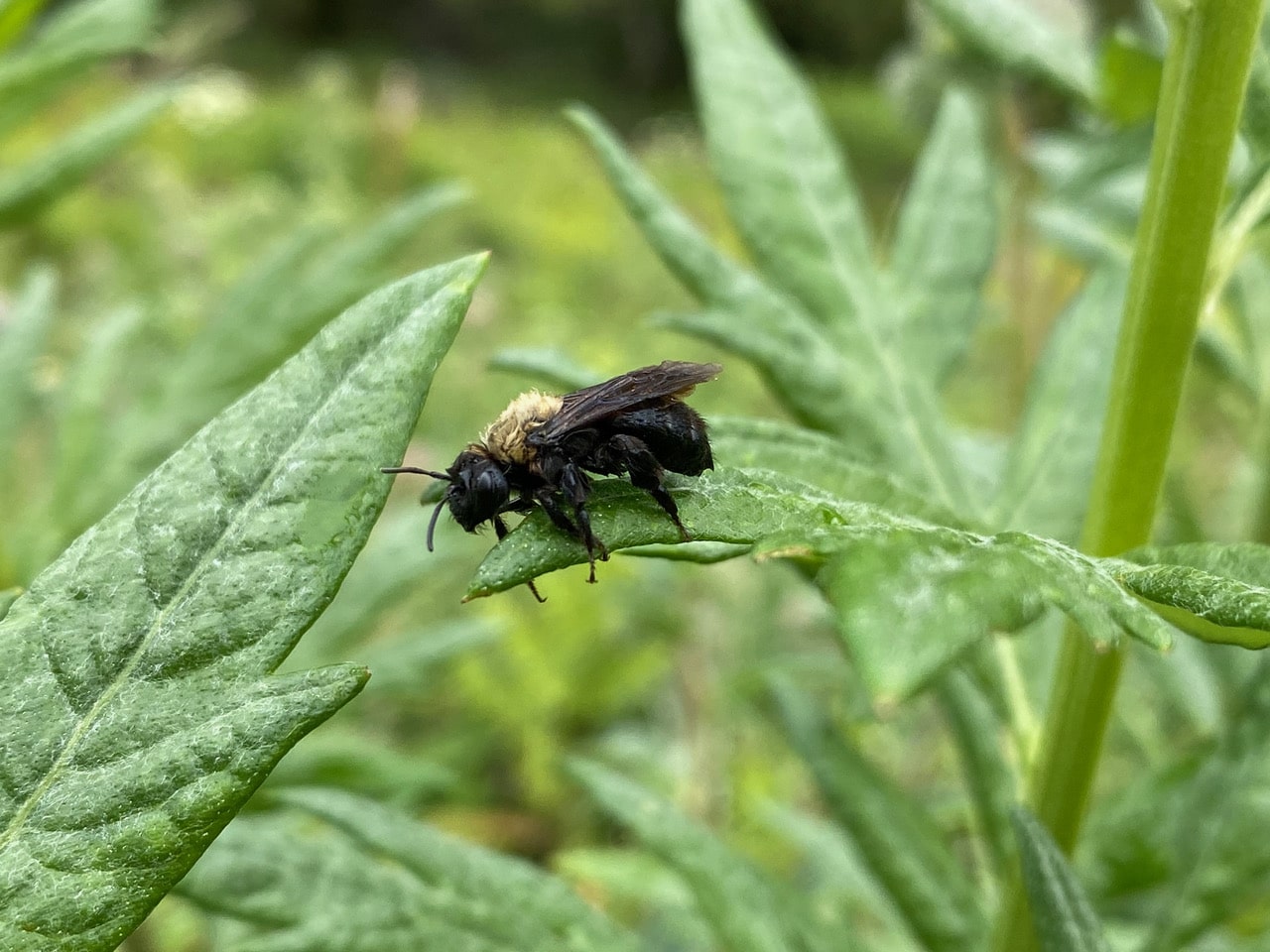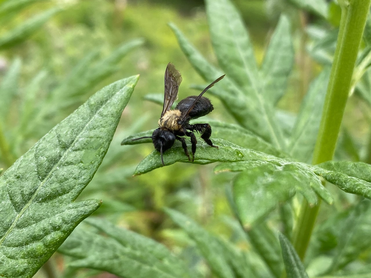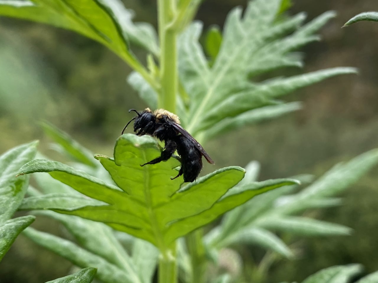 It hairs wet and matted, a little bee is hanging upside down under a leaf of California Mugwort, Artemisia douglasiana. It must have been caught unwittingly by the rain while out foraging and never made it home last night.