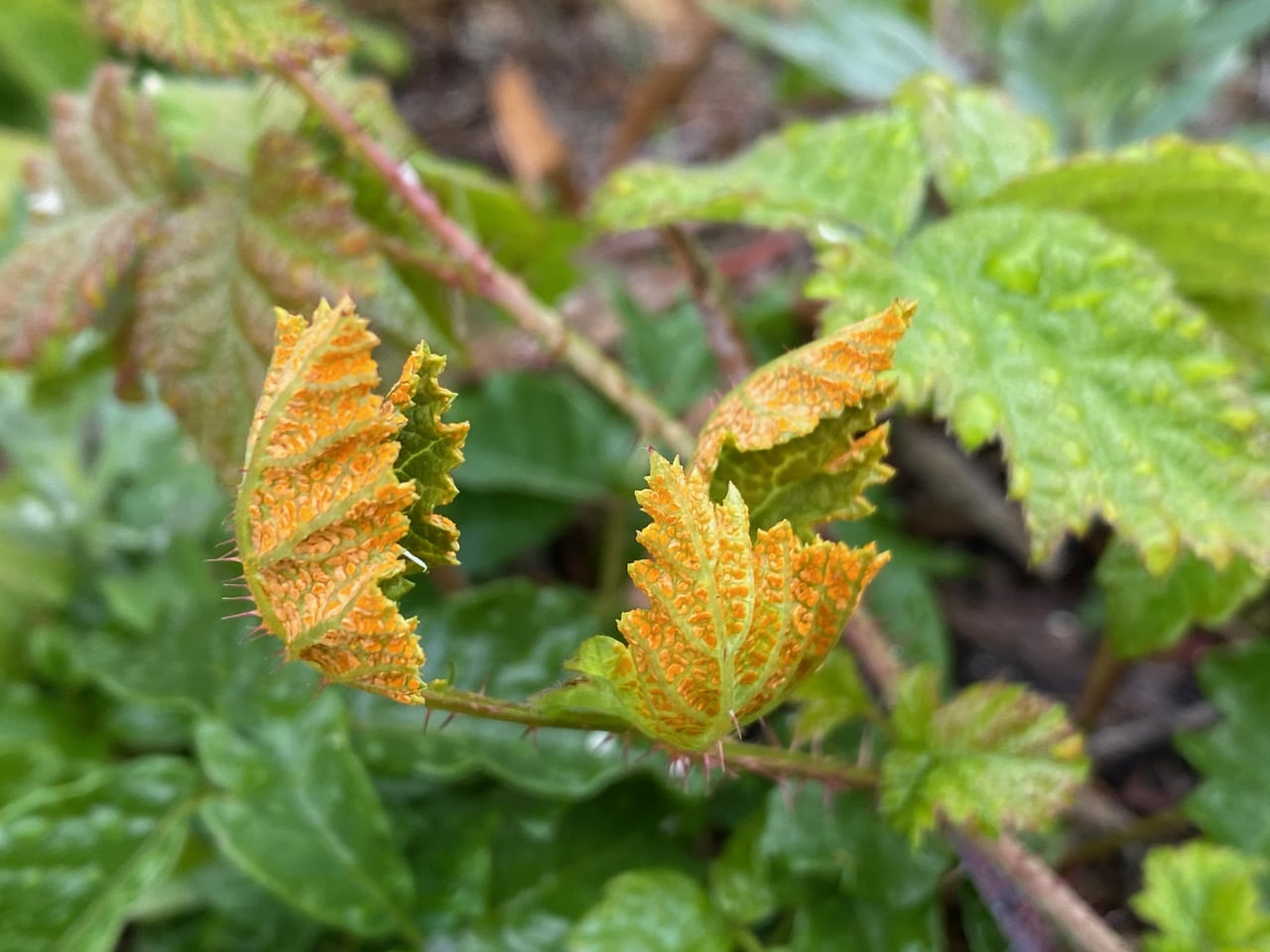 Blackberry Orange Rust is a systemic disease caused by the fungus Gymnoconia nitens. The infection is present throughout the plant for the rest of the plant’s life. Characteristic symptoms are spindly shoots with clustered, misshapen, pale green to yellowish leaves. The leaves are covered with bright orange, powdery blisters on the underside. Before the blisters burst open, they look waxy or shiny as if covered with lacquer. The orange pustules eventually release thousands of fungal spores which are carried on wind or water, and infect leaves of healthy plants during long periods of leaf wetness provided by rain or dew. Orange Rust is favored by relatively low temperatures (50-70 degrees F) and wet conditions. The fungus is systemic and overwinters in the crown and roots of infected plants.