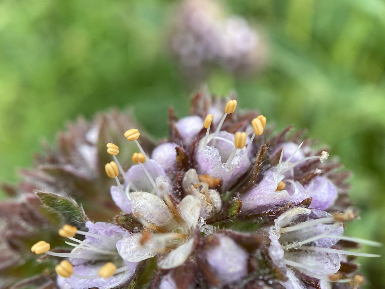 California Phacelia, Phacelia California has apparently continued to bloom through the rainy weather, sending out fresh yellow anthers above the corollas.