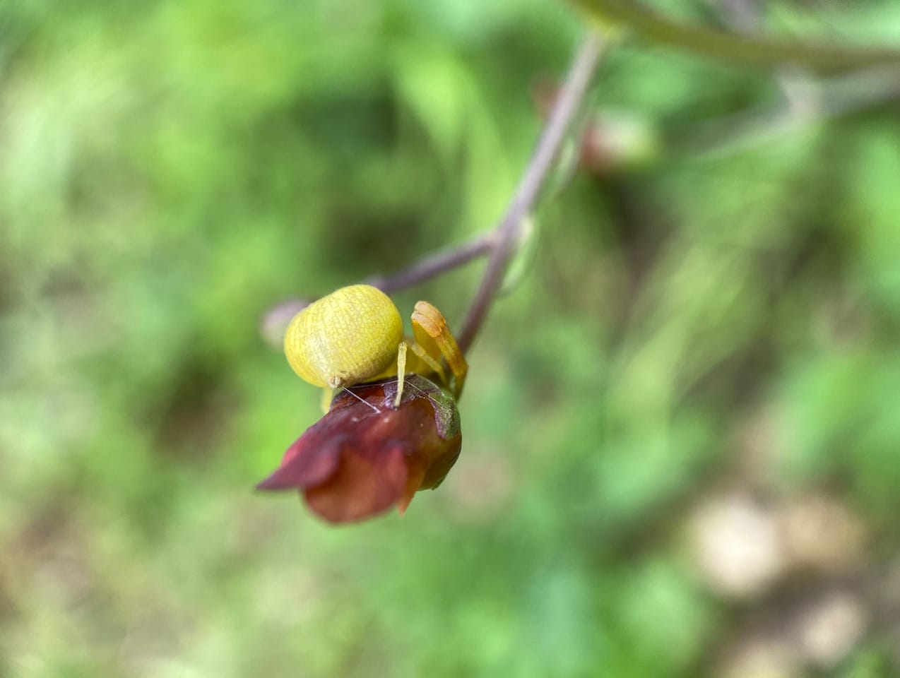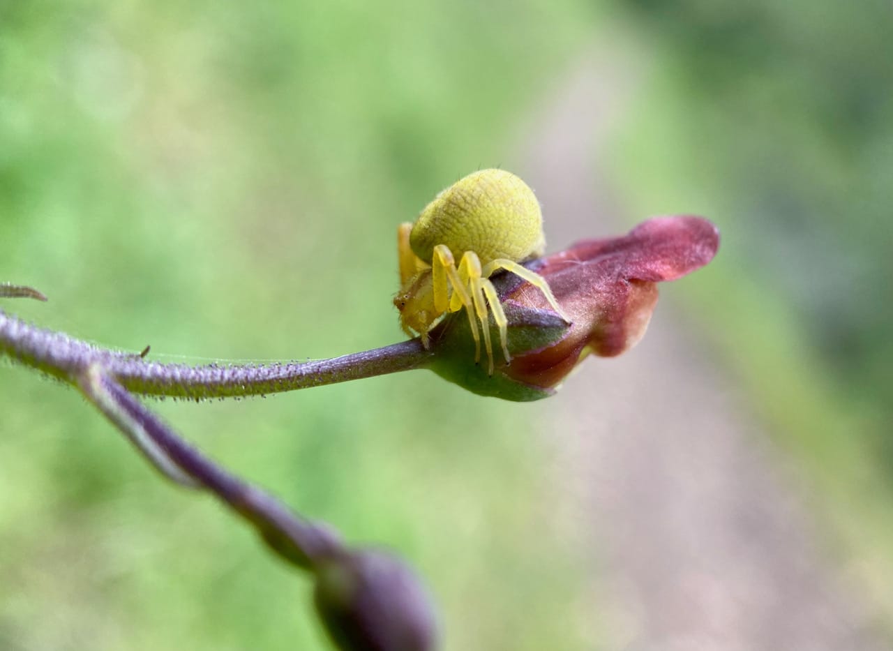 A yellow Crab Spider (family Thomisidae) can be seen from a distance sitting on a flower of California Bee Plant, Scrophularia californica. Why is the spider facing away from the entrance of the flower? How does she expect to catch any visiting insect?
