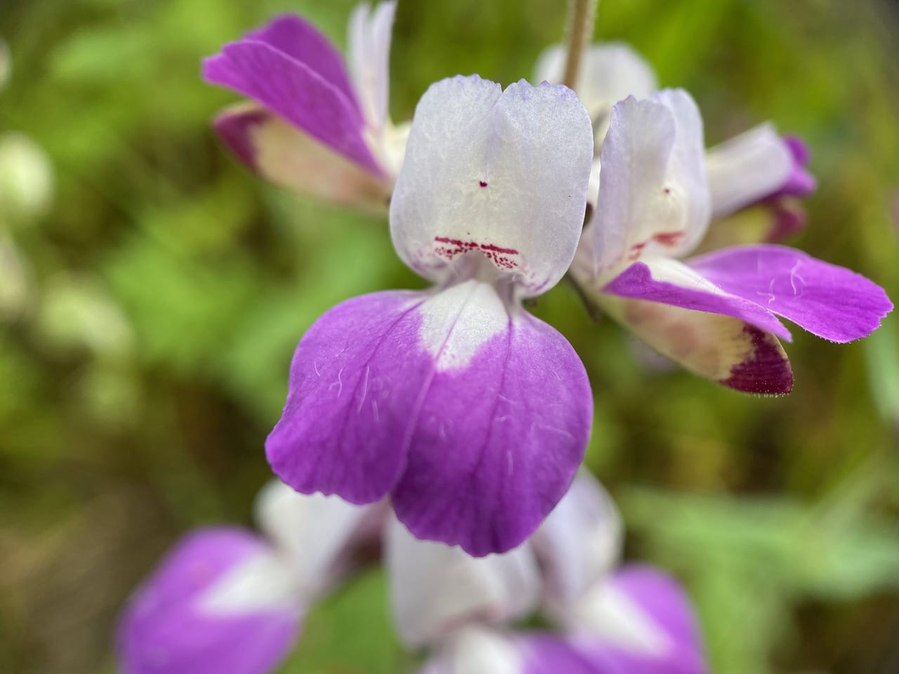 I take a closer look at the Chinese Houses flower and wonder what those red dots and dashes on the banners might be saying to the insect visitor. Flowers and bees have a secret language all their own. In the back, to the right is a side view of a flower showing the red-tipped keel under the wing petals. Dark blobs of anthers are visible through the translucent keel petal.