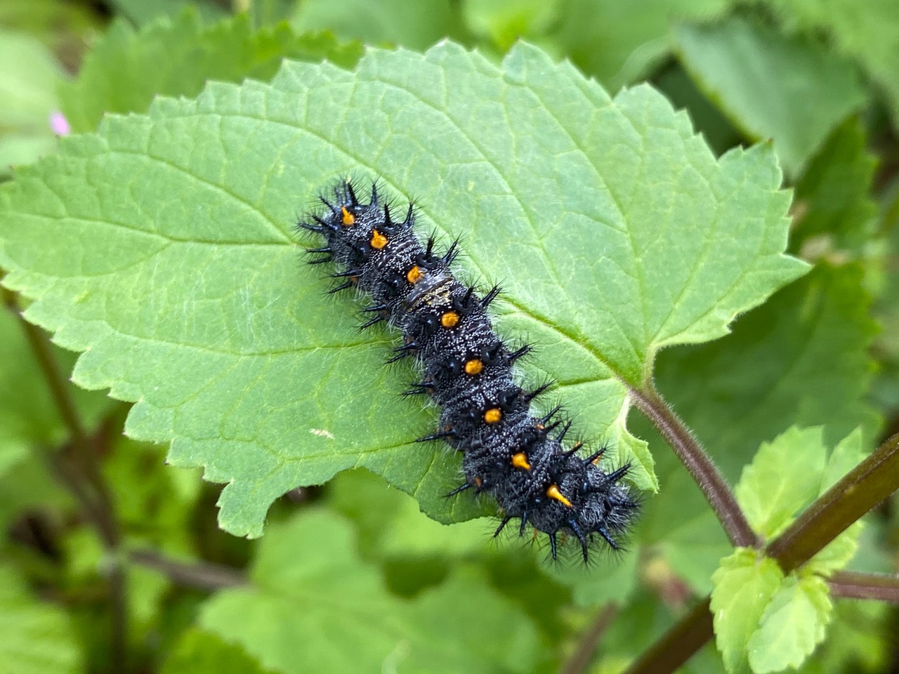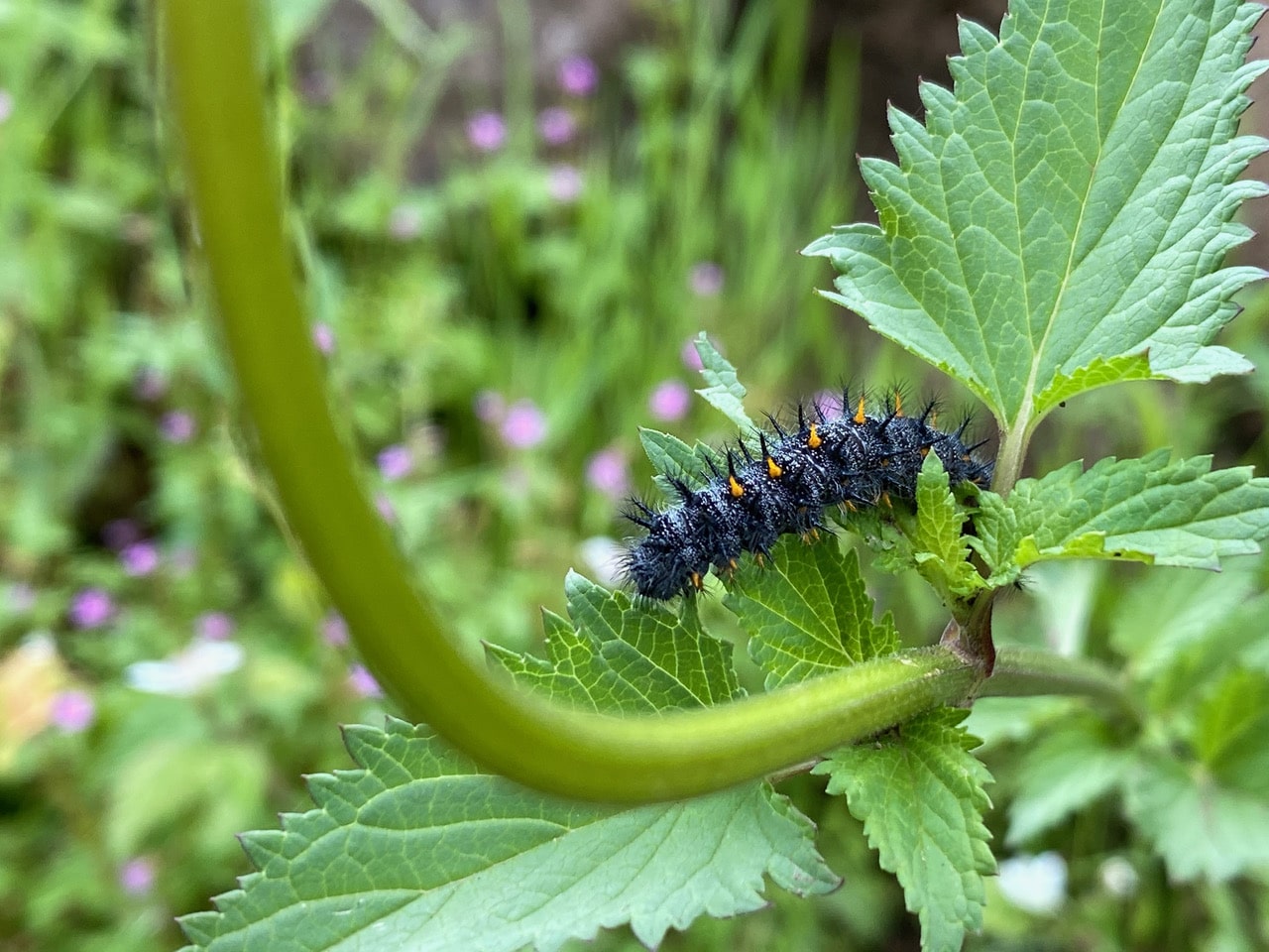 The Variable Checkerspot caterpillars, Euphydryas chalcedona (family Nymphalidae) on the California Bee Plants are getting big, but they are still feeding…