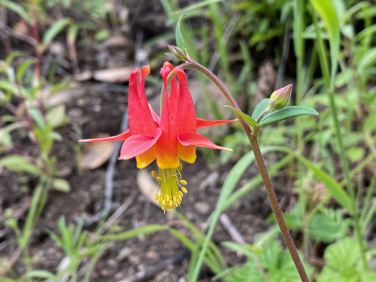 Close to Siesta Gate, the scarlet flowers of Western Columbine, Aquilegia formosa has brightened up the steep slopes along Skyline Trail.