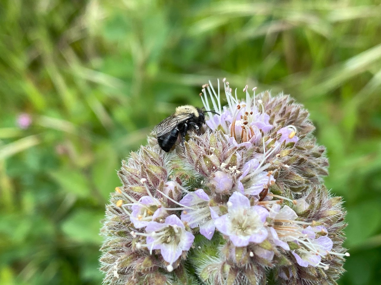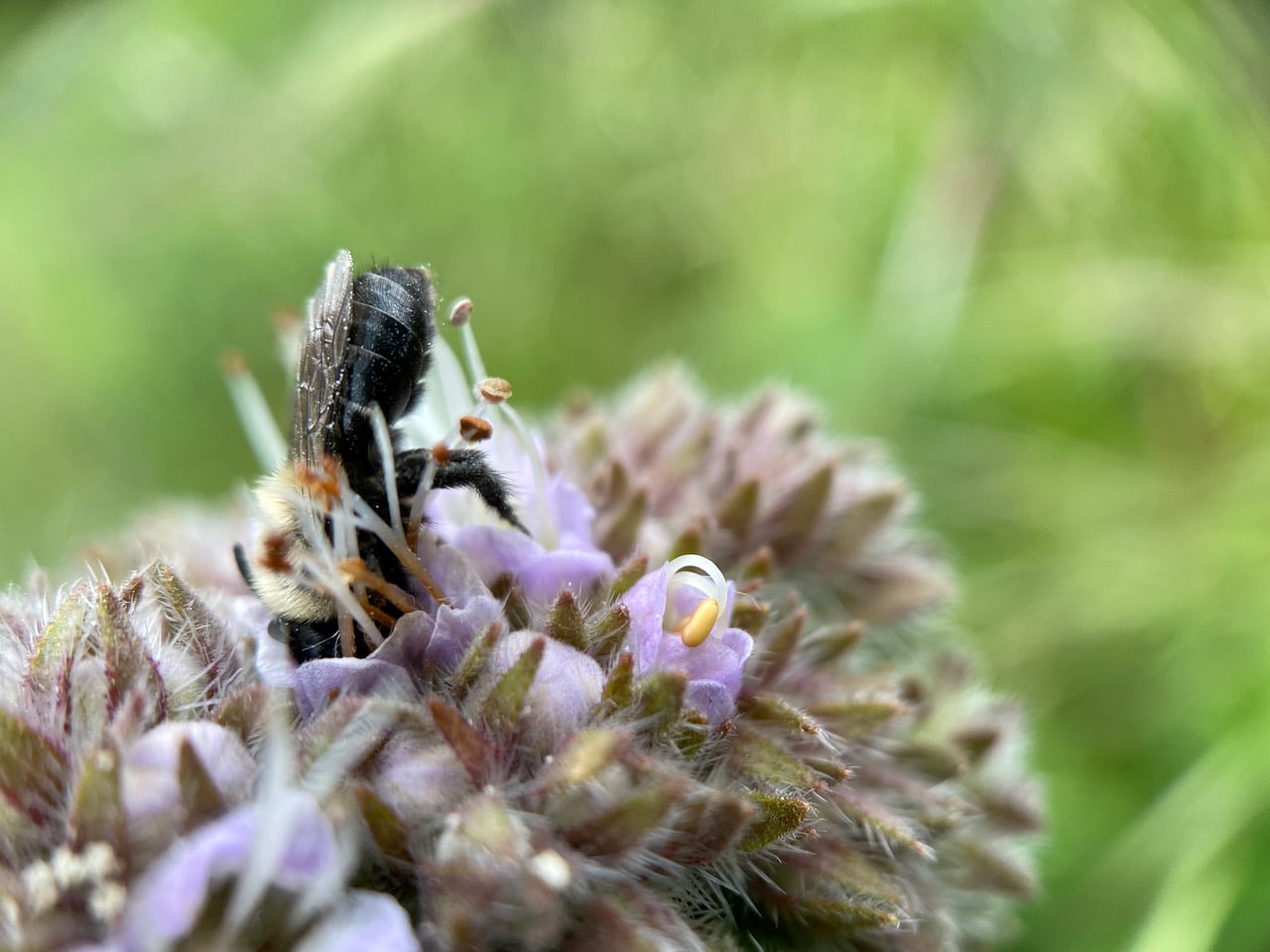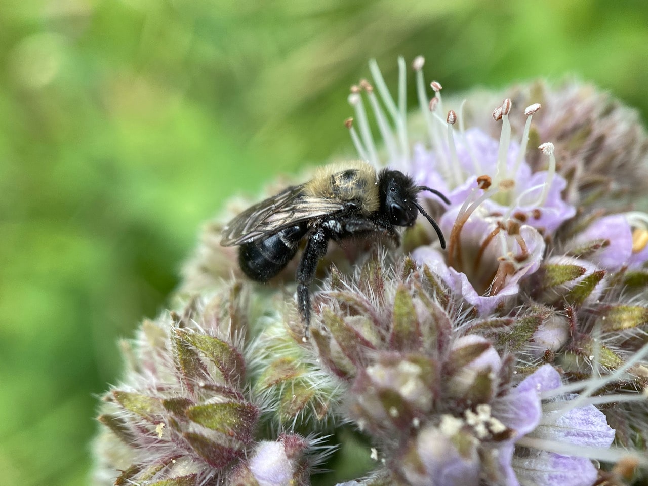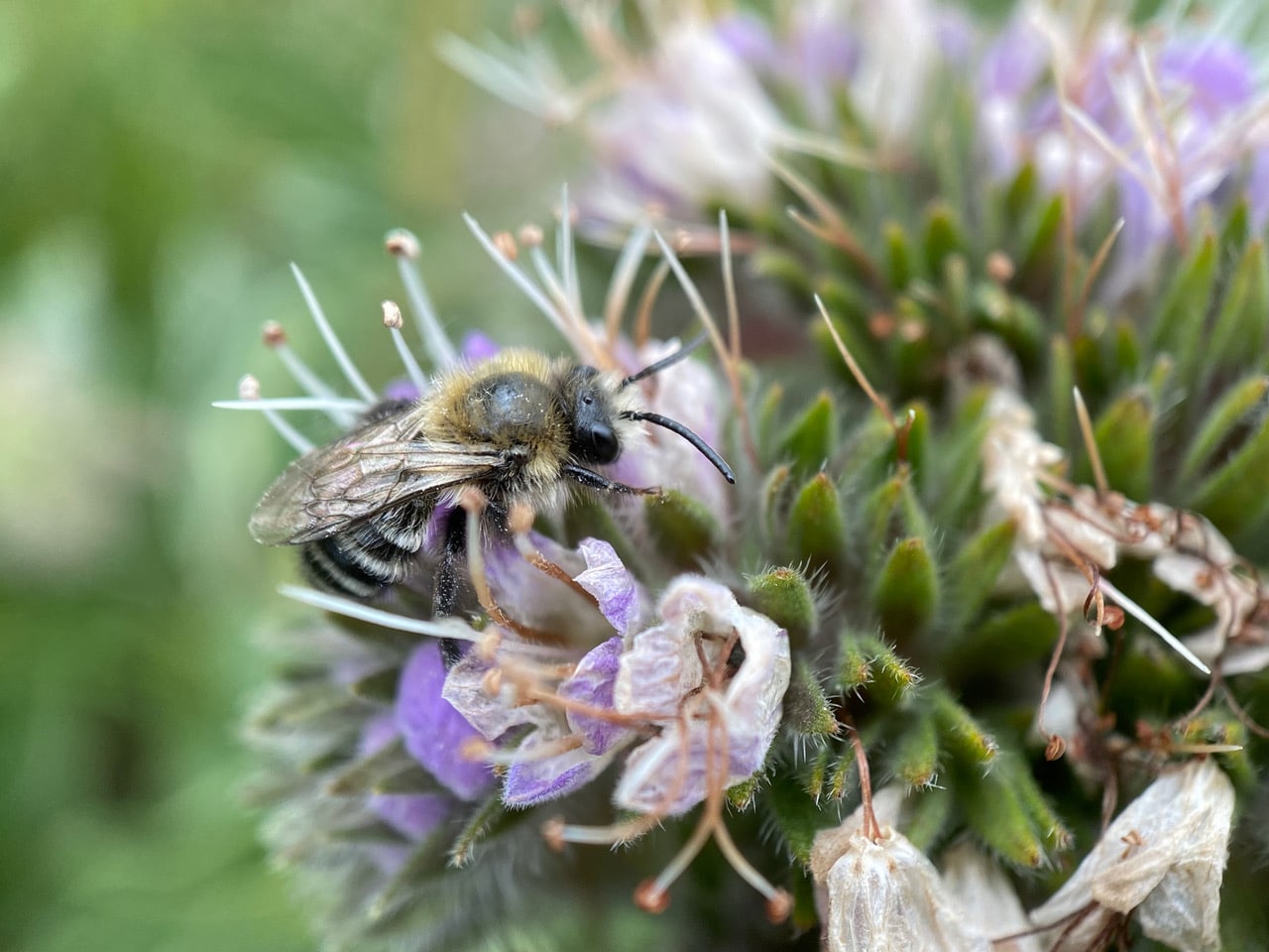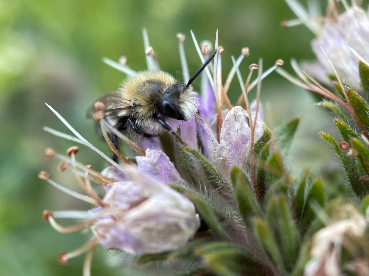 With a short tongue, the Colletes bee needs to reach deep into the corolla of the Phacelia flower for nectar.