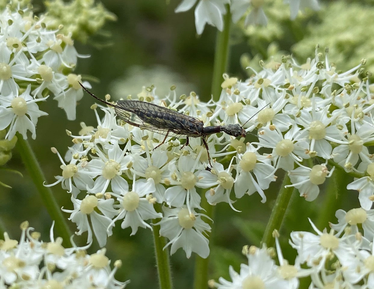 A female Snakefly (order Raphidioptera) is hunting on the Cow Parsnip flowers.