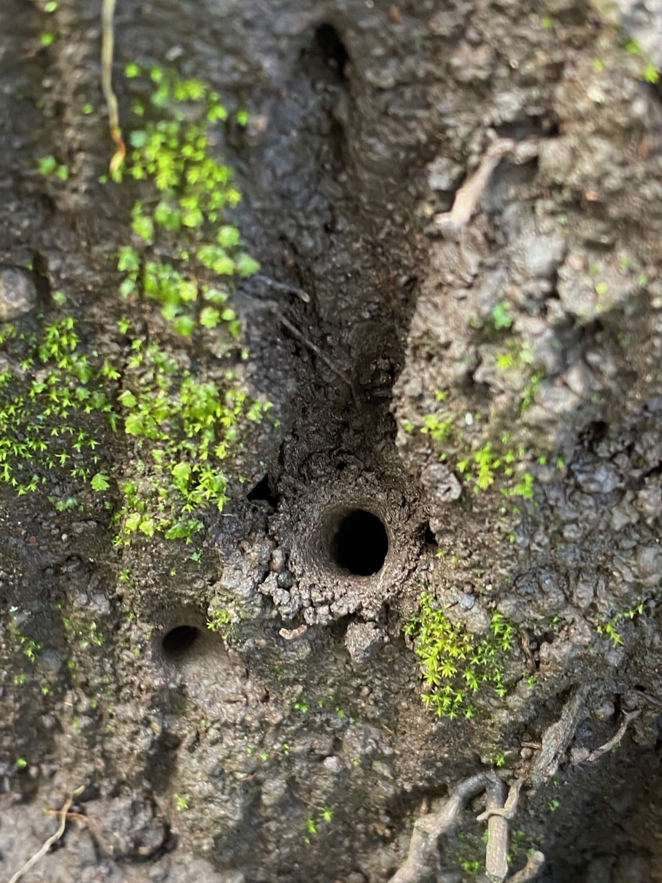 Despite the rains we had, the larval burrows of the Night-stalkingTiger Beetles (Omus sp., family Cicindelidae) on the exposed banks are remarkably clean, showing no signs of debris or erosion. These babies maintain their burrows meticulously!