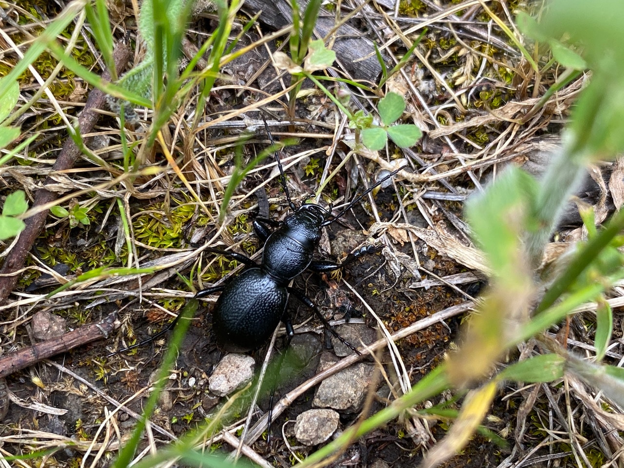 Just as I am about to walk into the shaded section of the trail under the canopy of Eucalyptus/ Bay trees, I spot a large, black beetle on the trail. Sensing my approach, the beetle quickly dodges into the undergrowth on the side of the trail. It has slender legs, and is fast running.