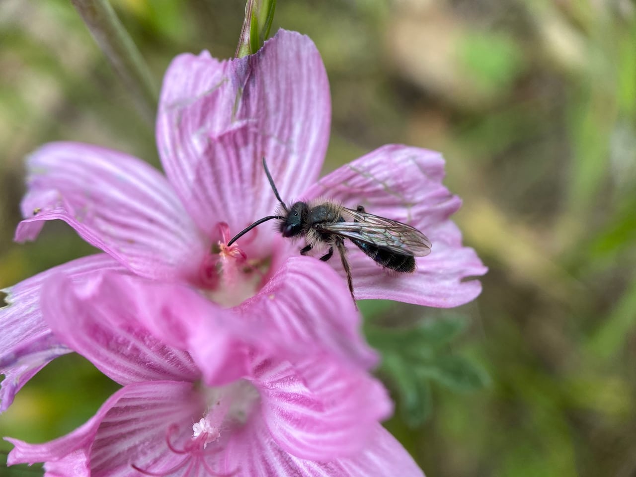 A male Mining Bee, Andrena sp. (family Andrenidae) visits a Checkerbloom flower, Sidalcea malviflora. The scruffy bee looks just as weary as the weather-beaten flower.
