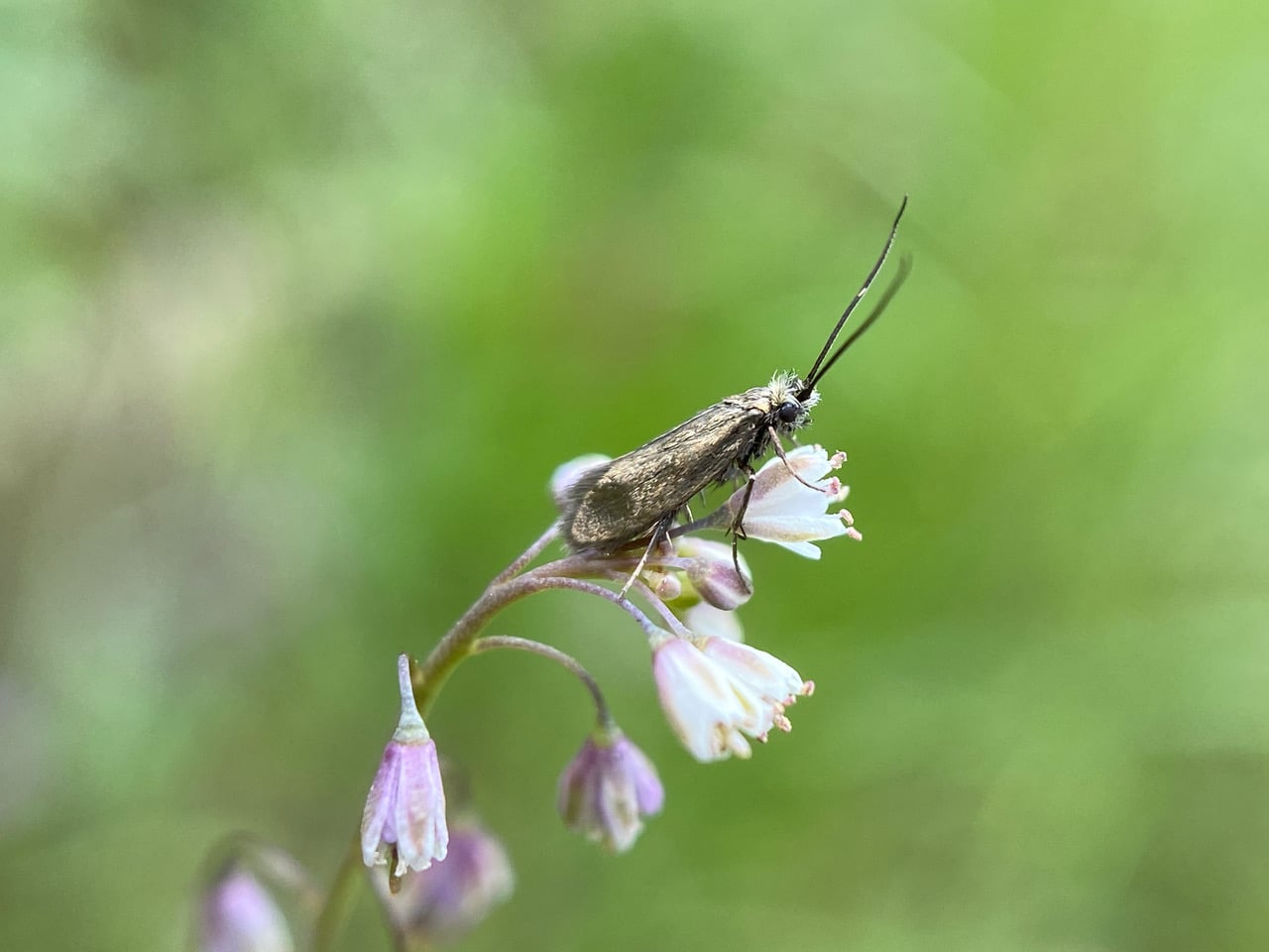 It is a cool, cloudy afternoon. Most of the Fringe Pods, Thysanocarpus curvipes (family Brassicaceae) have finished blooming. Out of habit, my eyes scan the plants along the edges of the trail, hoping to spot a tiny moth. As luck would have it, I find a single Fairy Longhorn Moth, Cauchas simpliciella (family Adelidae) standing on the top of a spike of flowers. Unlike most of the others I have photographed, this one does not have orange hairs on its head. Cauchas species all use plants of the mustard family or Brassicaceae as their larval host plants. I wonder what part of the plant the caterpillars eat, as most of the annual herb will be gone soon.