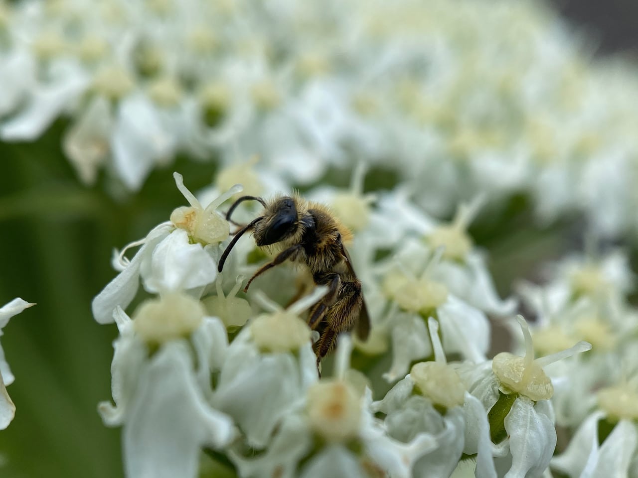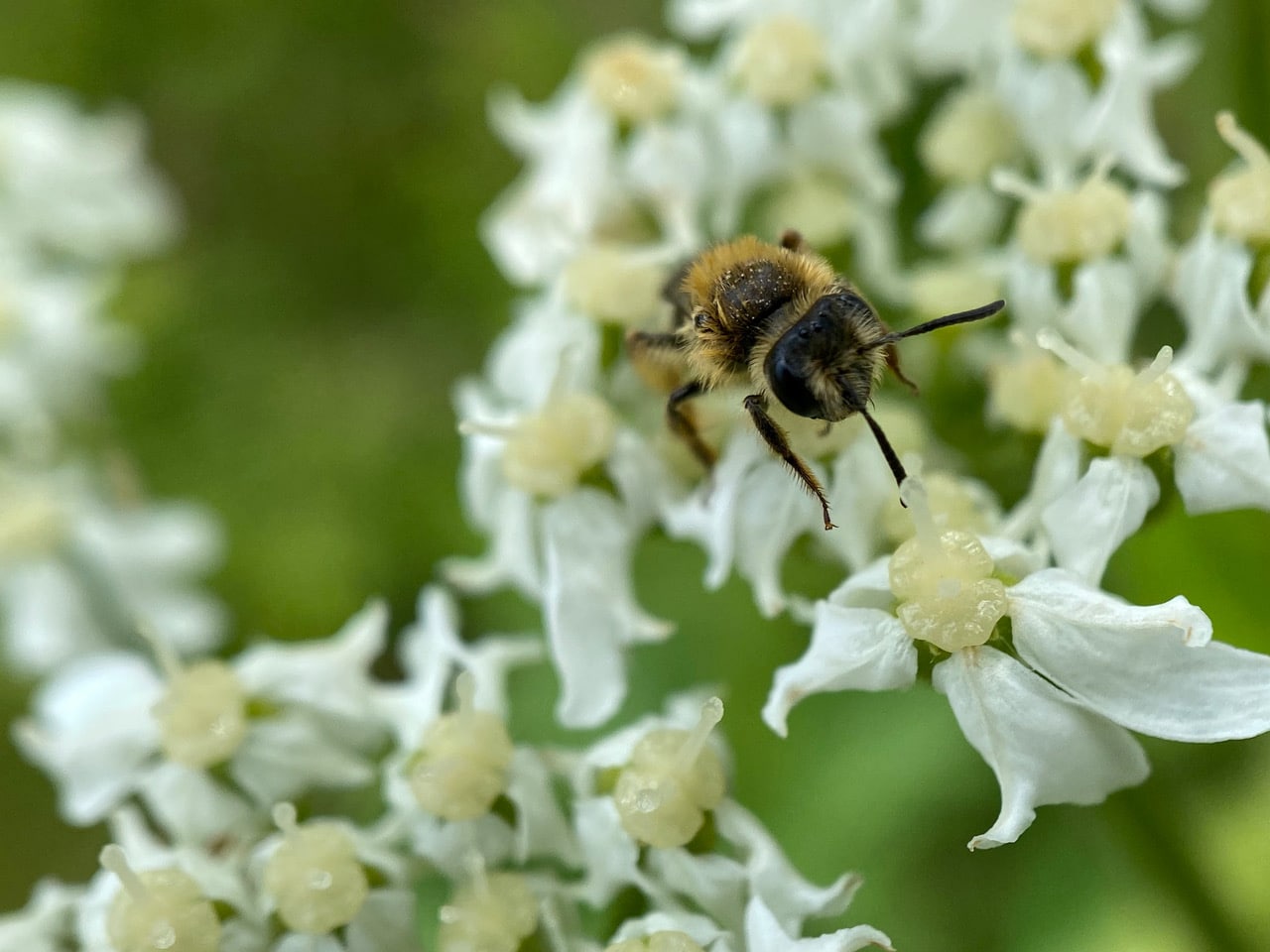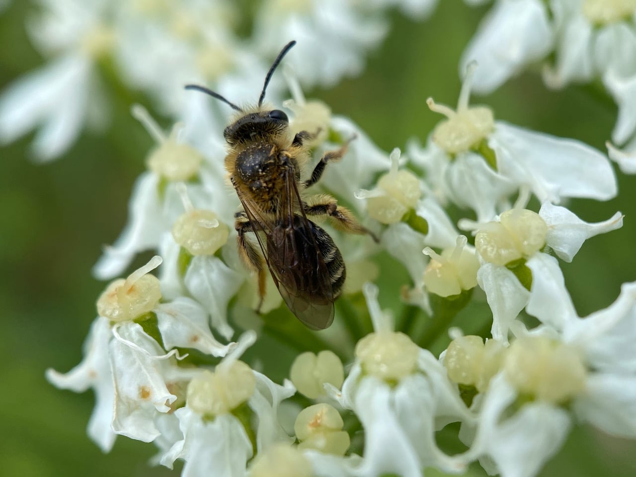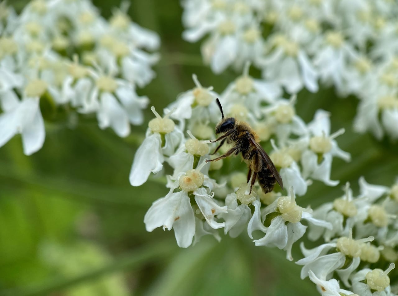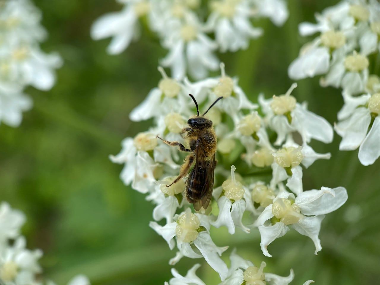A little bee is moving slowly on an umbel of Cow Parsnip flowers. A Golden-haired Miner Bee, Andrena auricoma (family Andrenidae)? Without the sun, the hairs do not shine. See those long hairs on her hind legs? The bee is a female with empty scopae – she is not gathering pollen.