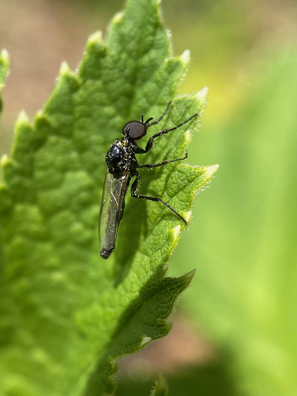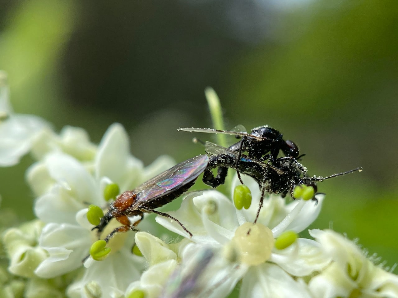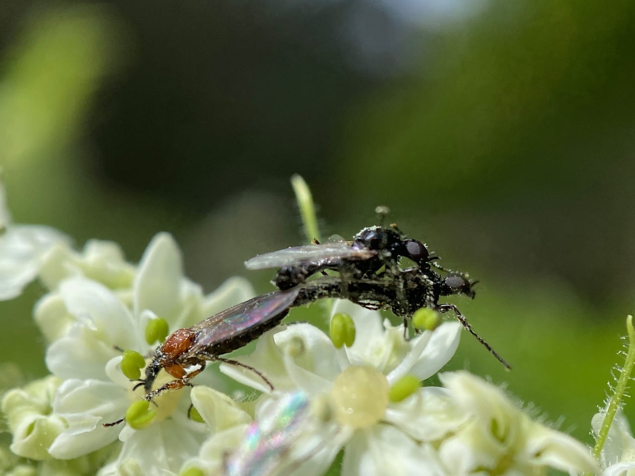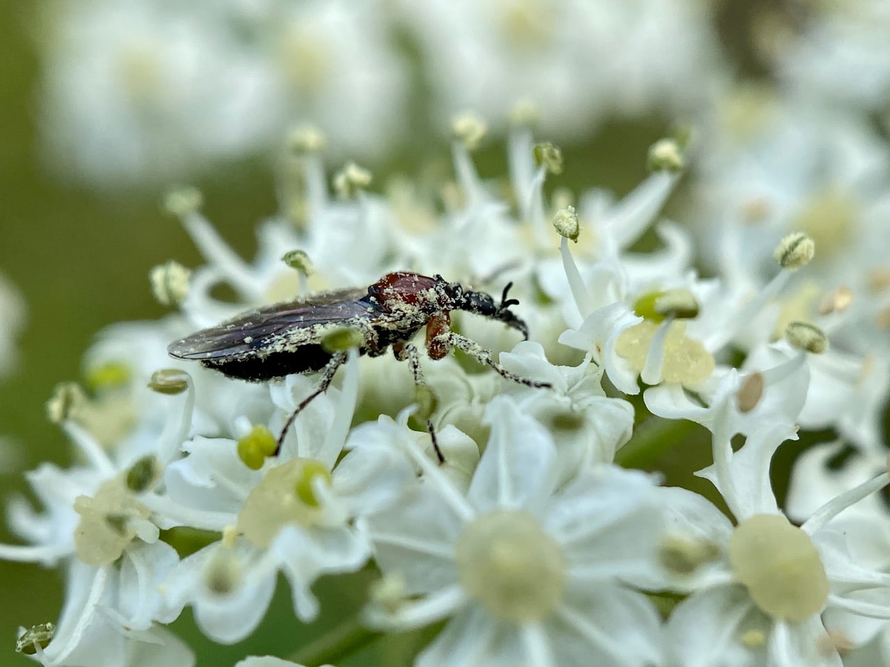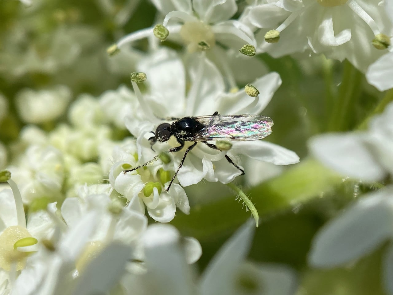 A female March Fly, Dilophus strigilatus (family Bibionidae) is covered with sticky pollen as she forages among the flowers of Cow Parsnip, Heracleum maximum. No wonder these little flies are considered good pollinators.