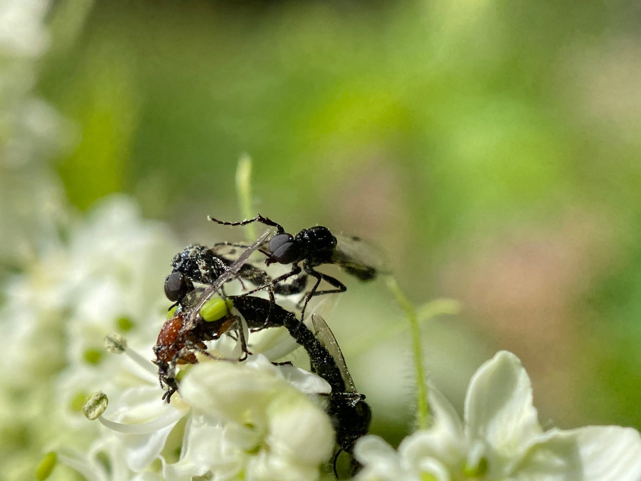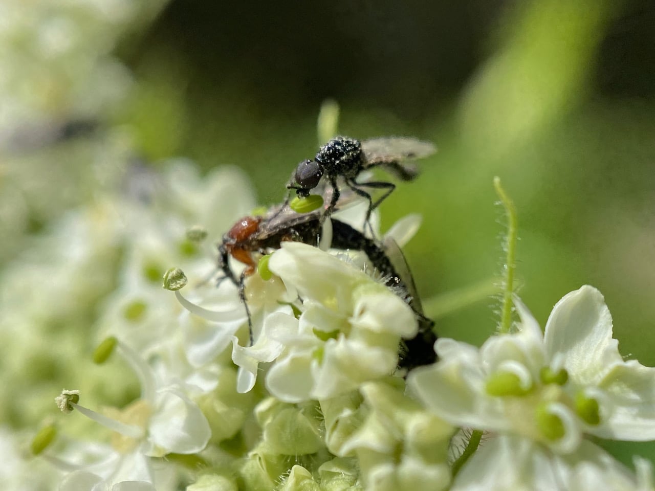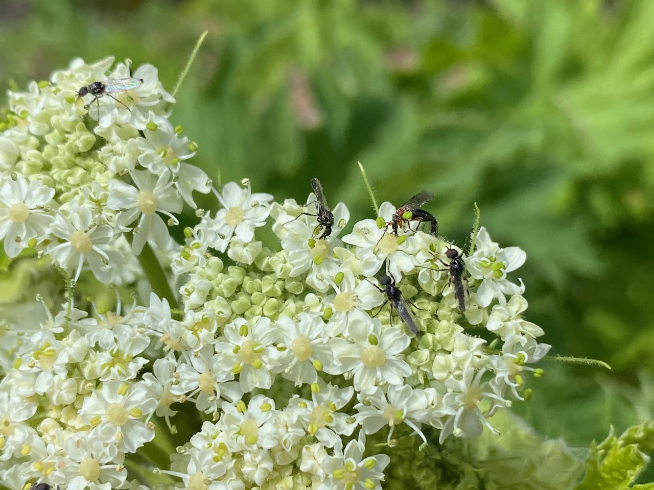Some March Flies have alighted on an inflorescence of Cow Parsnip, some in copula. There seems to be a preponderance of males.