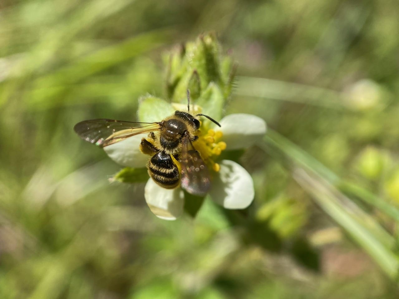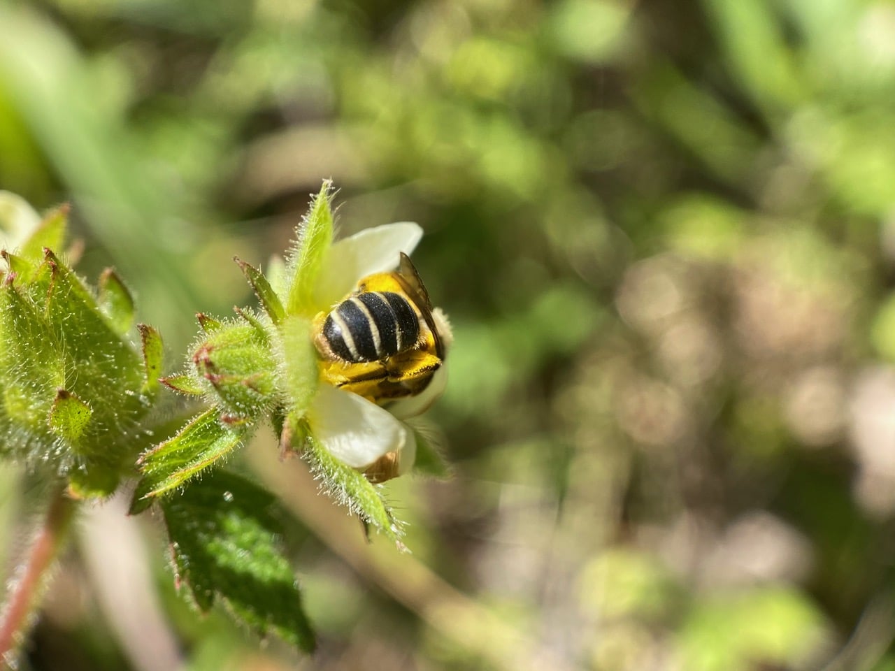 A bee with a black-and-white striped abdomen lands on a Sticky Cinquefoil flower. It is female as evidenced by the pollen on her scopae. Male bees do not collect pollen.