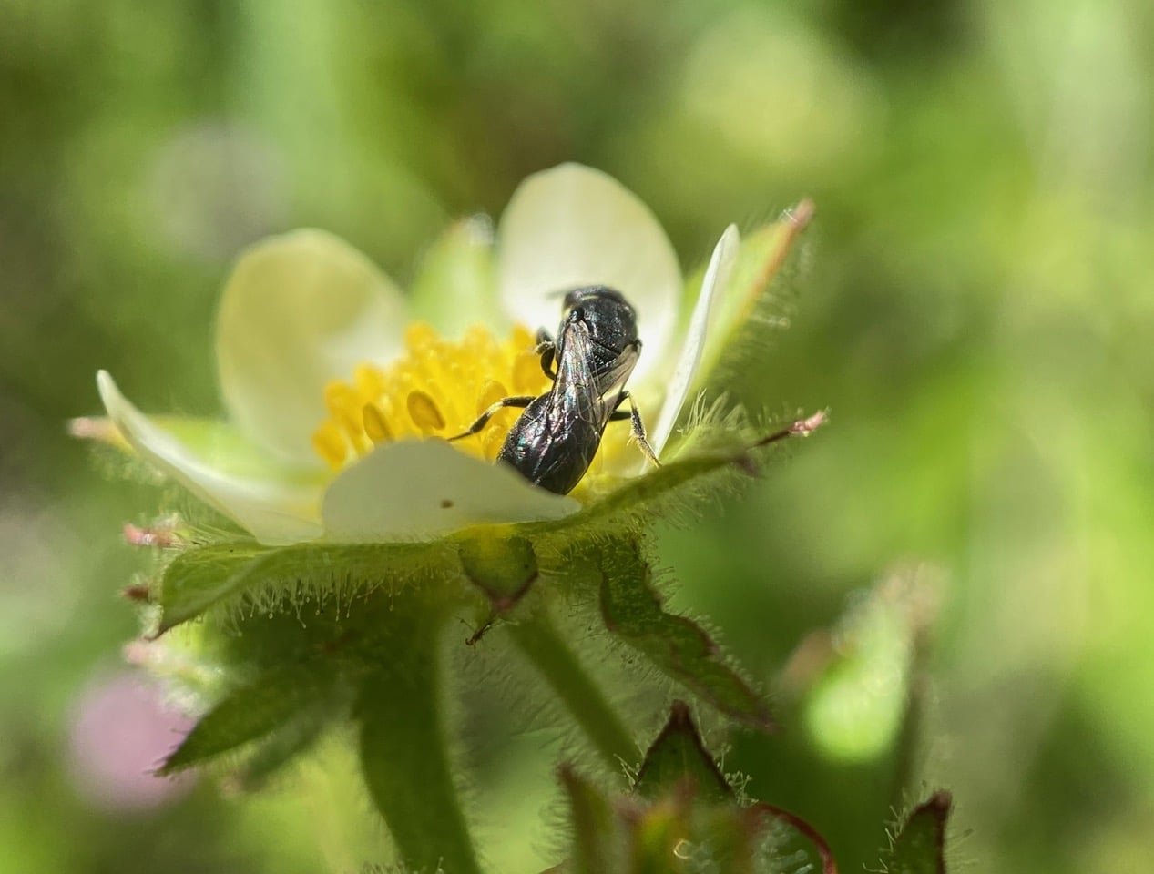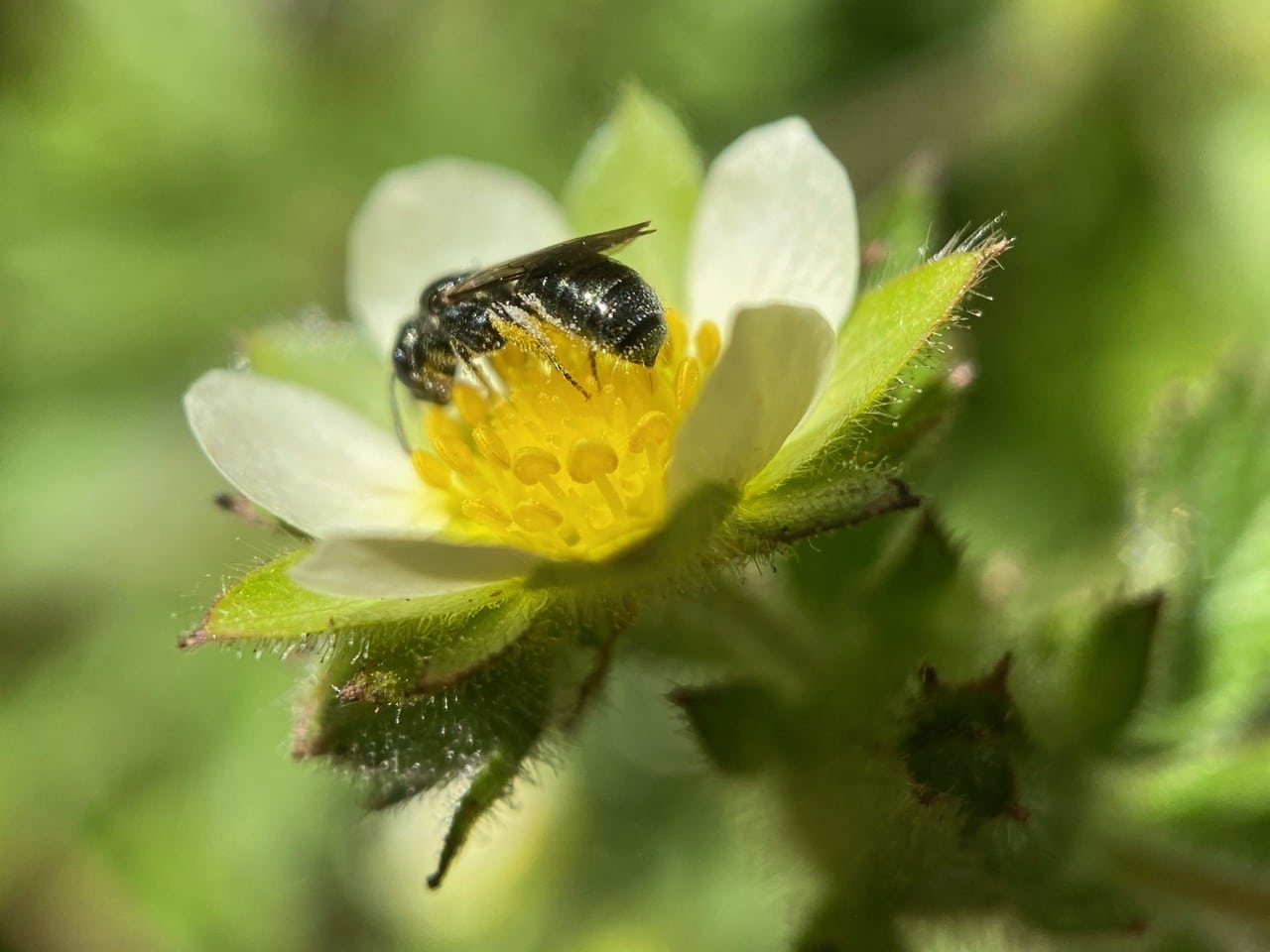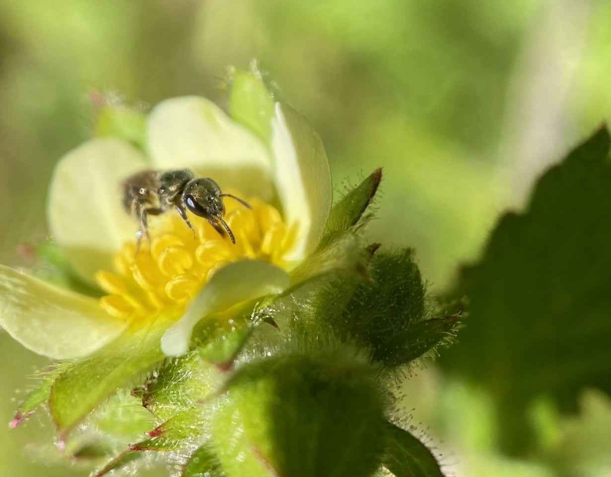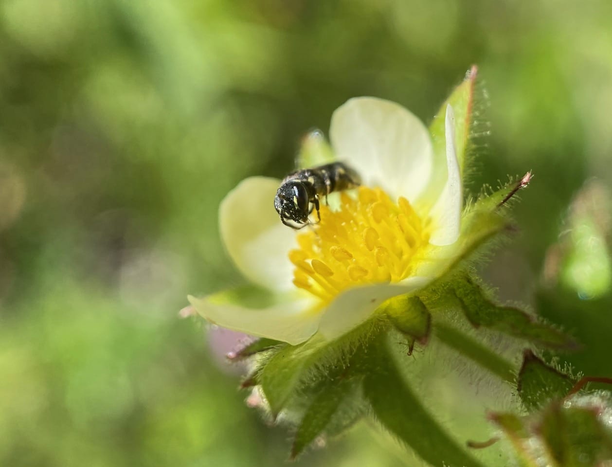 Hey, here’s a different bee on the Sticky Cinquefoil flower. It is even smaller than the small Carpenter Bee, only the size of a grain of rice.