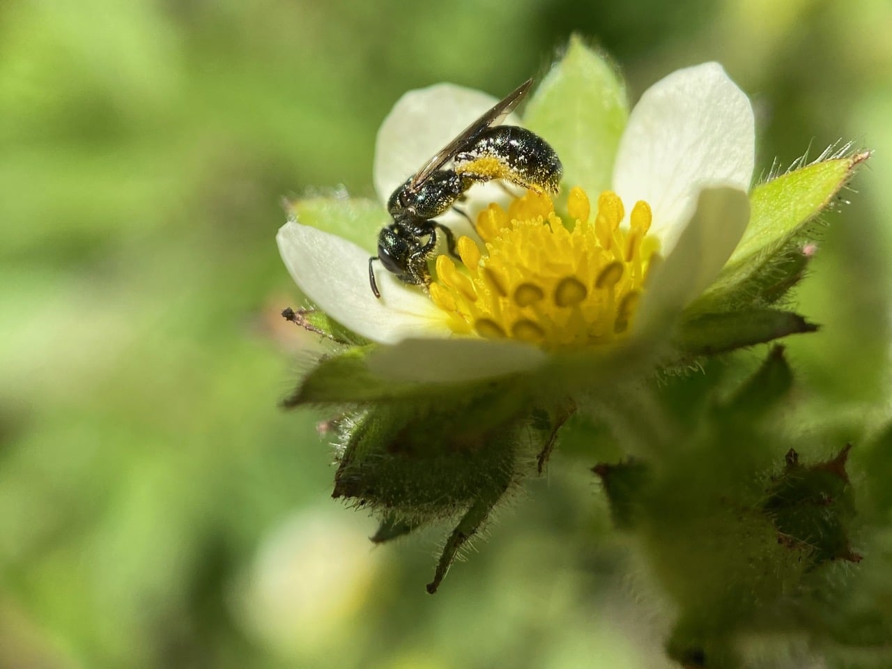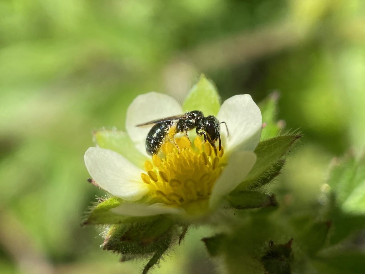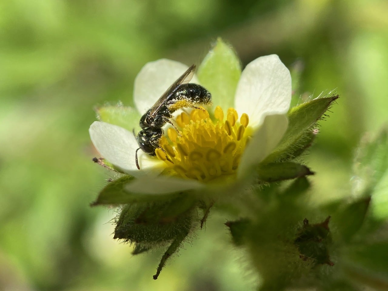 Hey, here’s a different bee on the Sticky Cinquefoil flower. It is even smaller than the small Carpenter Bee, only the size of a grain of rice.