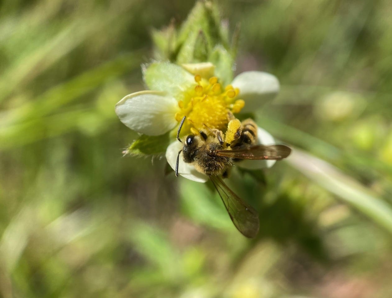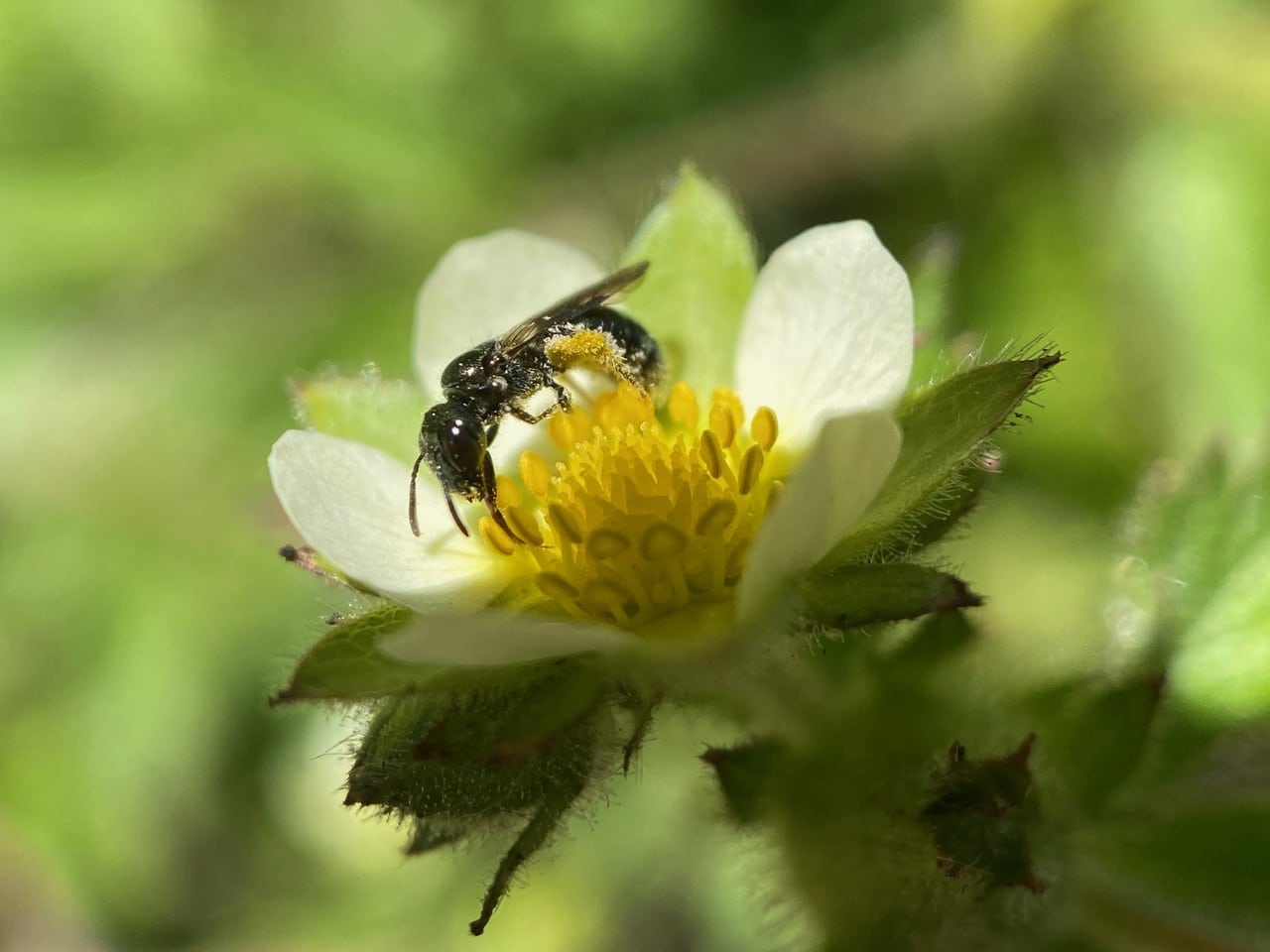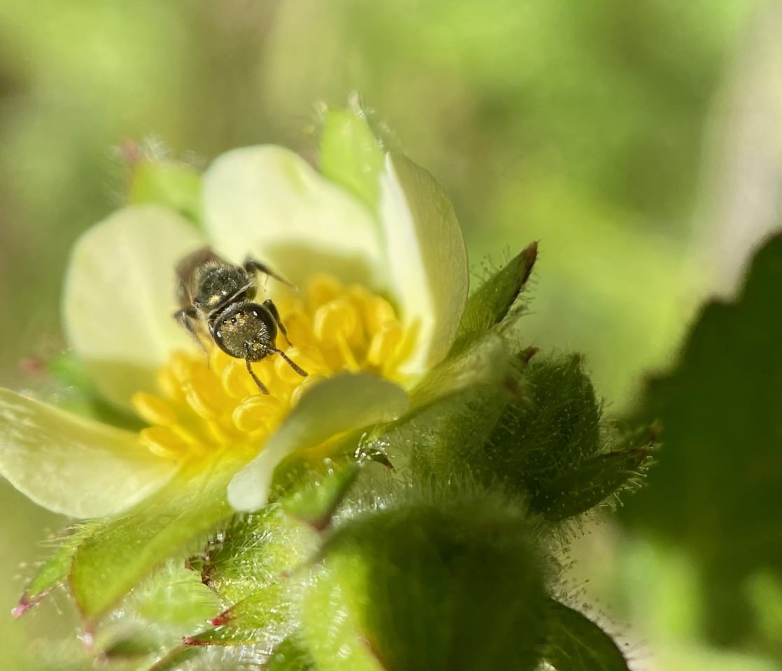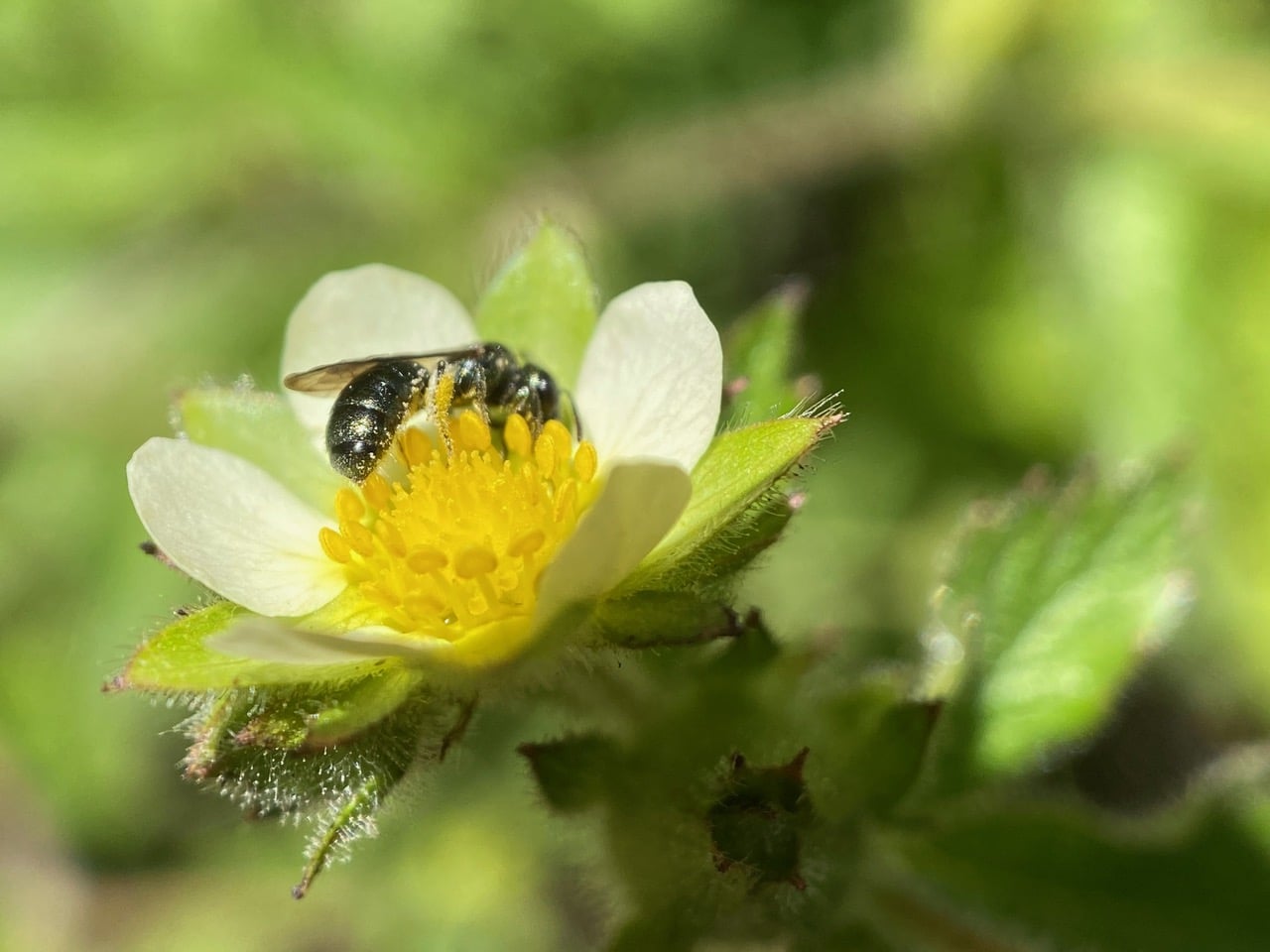 Hey, here’s a different bee on the Sticky Cinquefoil flower. It is even smaller than the small Carpenter Bee, only the size of a grain of rice.