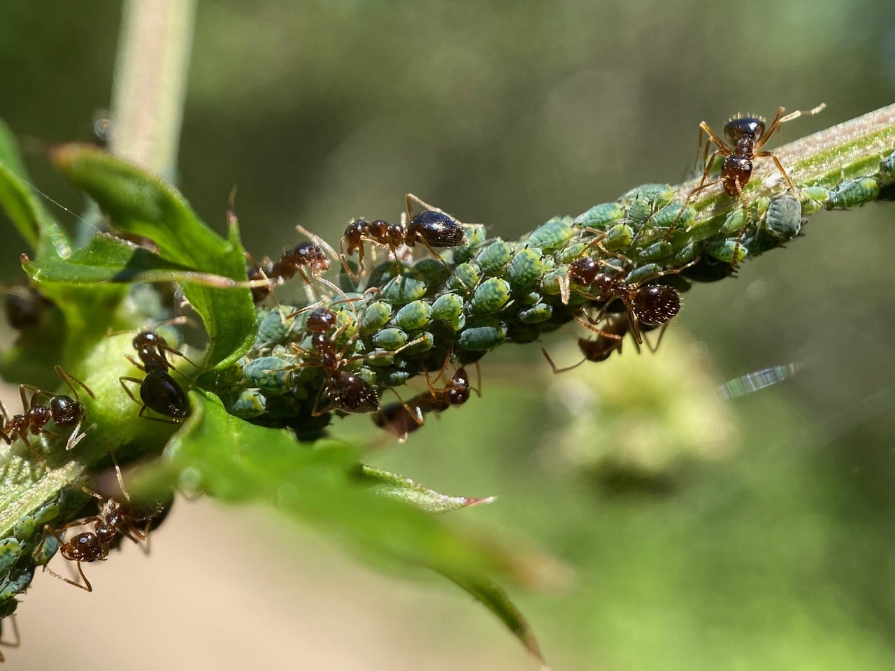 Ants and aphids share a well-known mutualistic relationship. The aphids produce honeydew, a sugary food for the ants; in exchange, the ants care for and protect the aphids from predators and parasites. Some ants will “milk” the aphids to make them excrete the sugary substance. The ants stroke the aphids with their antennae, stimulating them to release the honeydew. Aphid-herding ants make sure the aphids are well-fed and safe. When the host plant is depleted of nutrients, the ants carry their aphids to a new food source. If predatory insects or parasites attempt to harm the aphids, the ants will defend them aggressively. Some species of ants continue to care for aphids during winter. The ants carry the aphids to their nest for the winter months, and transport them to a host plant to feed the following spring.