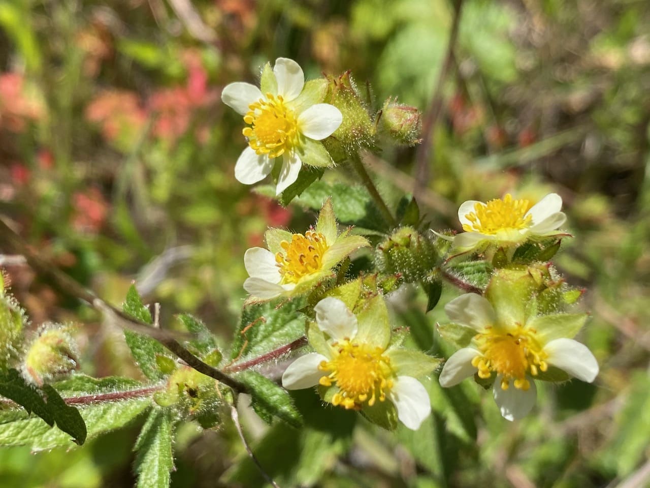 The Sticky Cinquefoil, Drymocallis glandulosa is in peak bloom now along Skyline Trail. Although the small white flowers are inconspicuous they are a good source of nectar and pollen, much loved by the small bees.