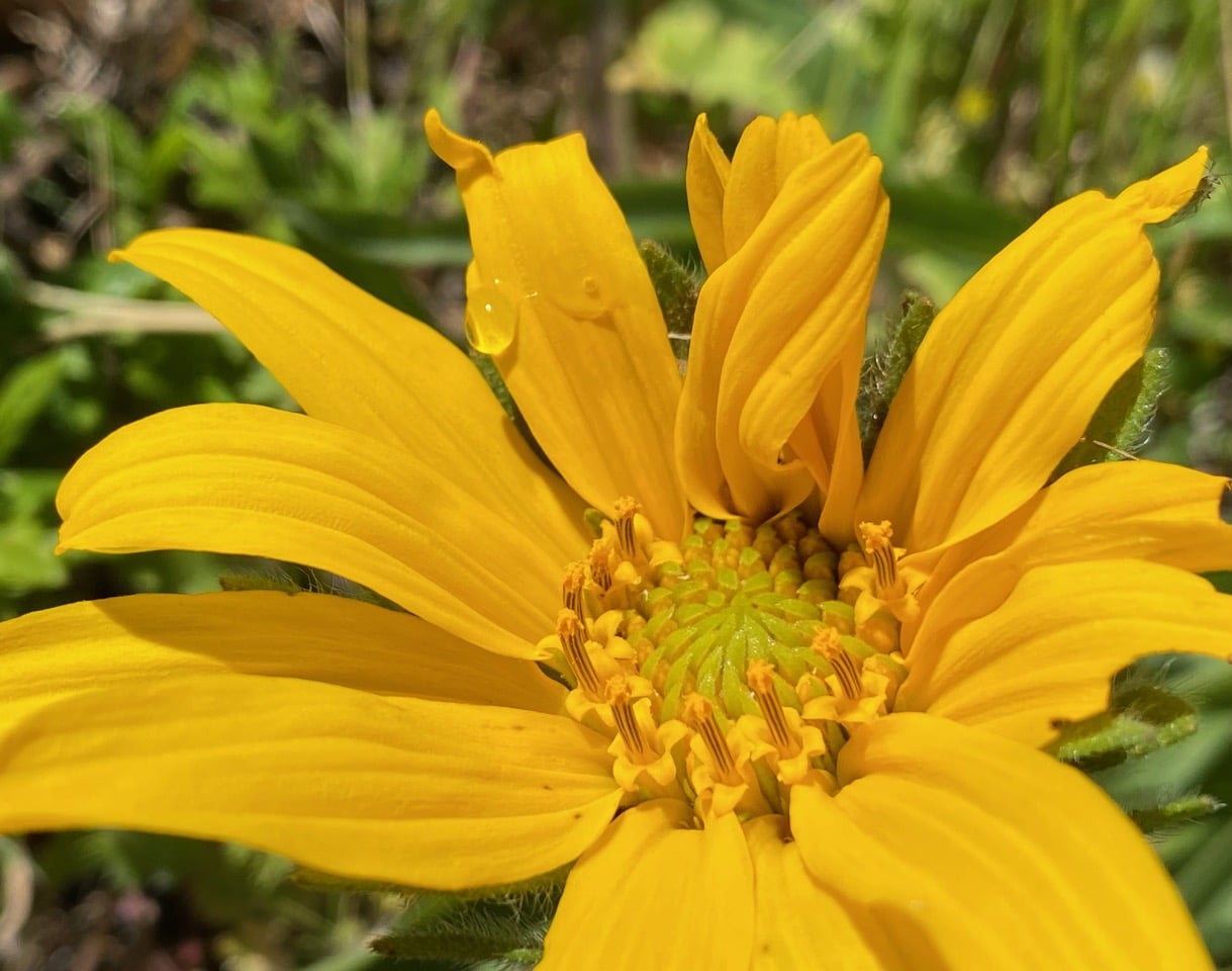 A second species of Mule Ears has come into bloom to replace the Woolly Mule Ears that have gone to seed on the same hillside. This is the Narrow Leaf Mule Ears, Wyethia angustifolia. The leaves of Narrow Leaf Mule Ears are not hairy, and are greener. Who has chewed that big hole in the ray petals? I see a green caterpillar half concealed between the ray petals across the flowerhead.
