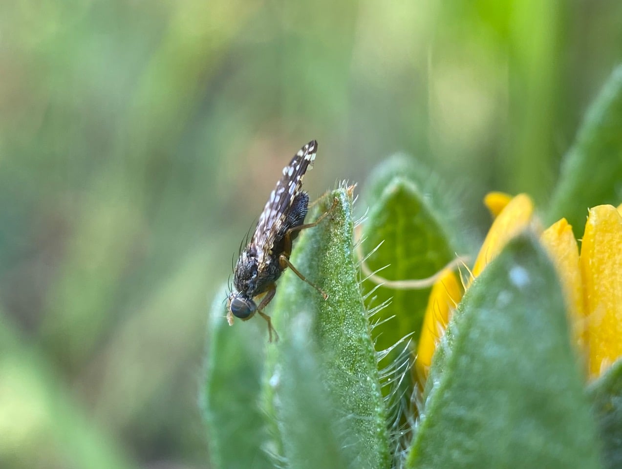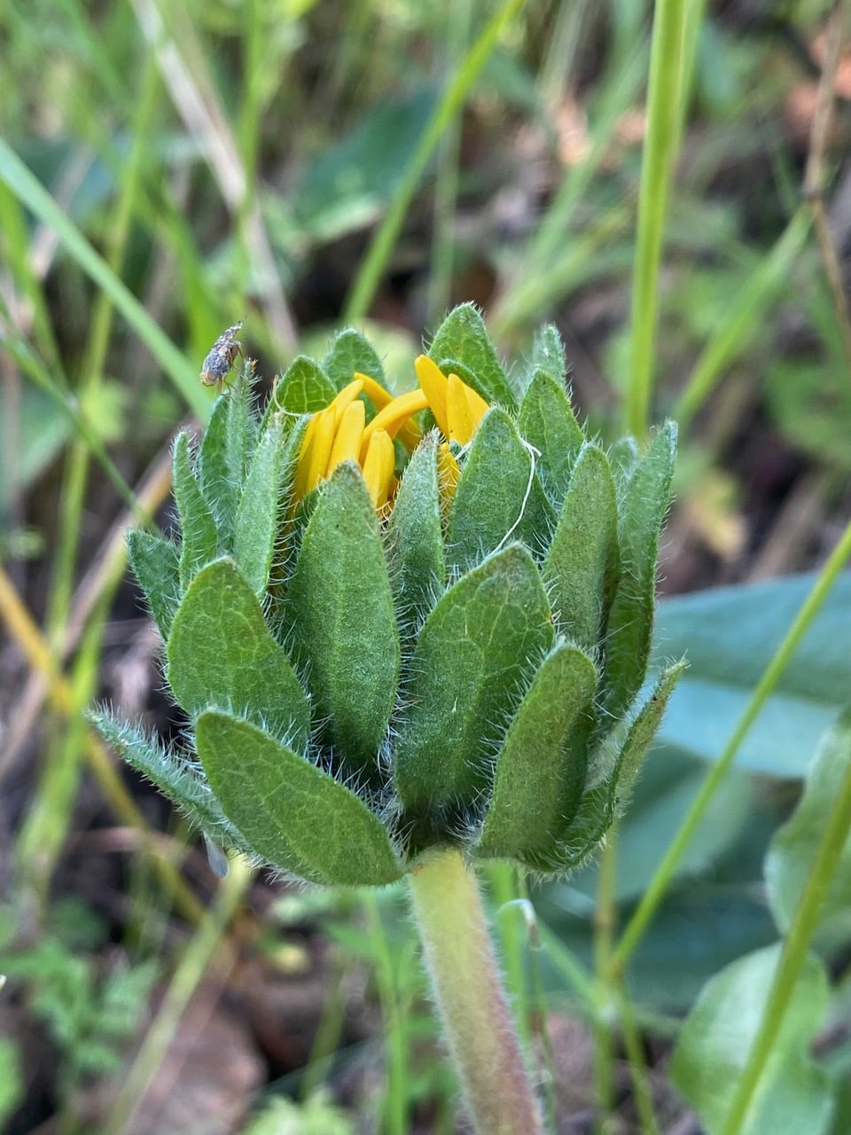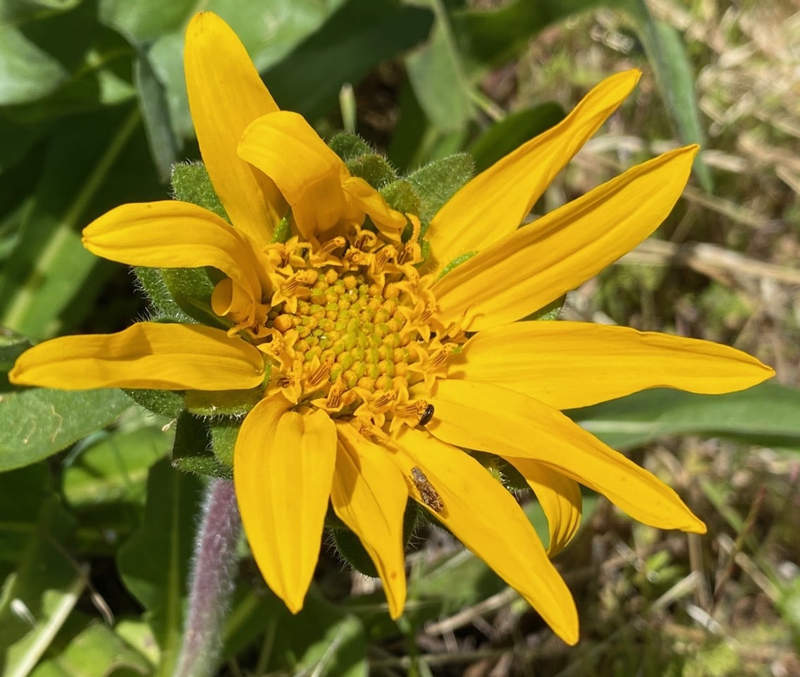 An immature flowerhead of the Narrow leaf Mule Ears is subtended by several tiers of large phyllaries. It appears the young flowerhead has already been claimed by a Sunflower Seed Maggot, Neotephritis finalis (family Tephritidae). See the male standing guard on an upper phyllary?