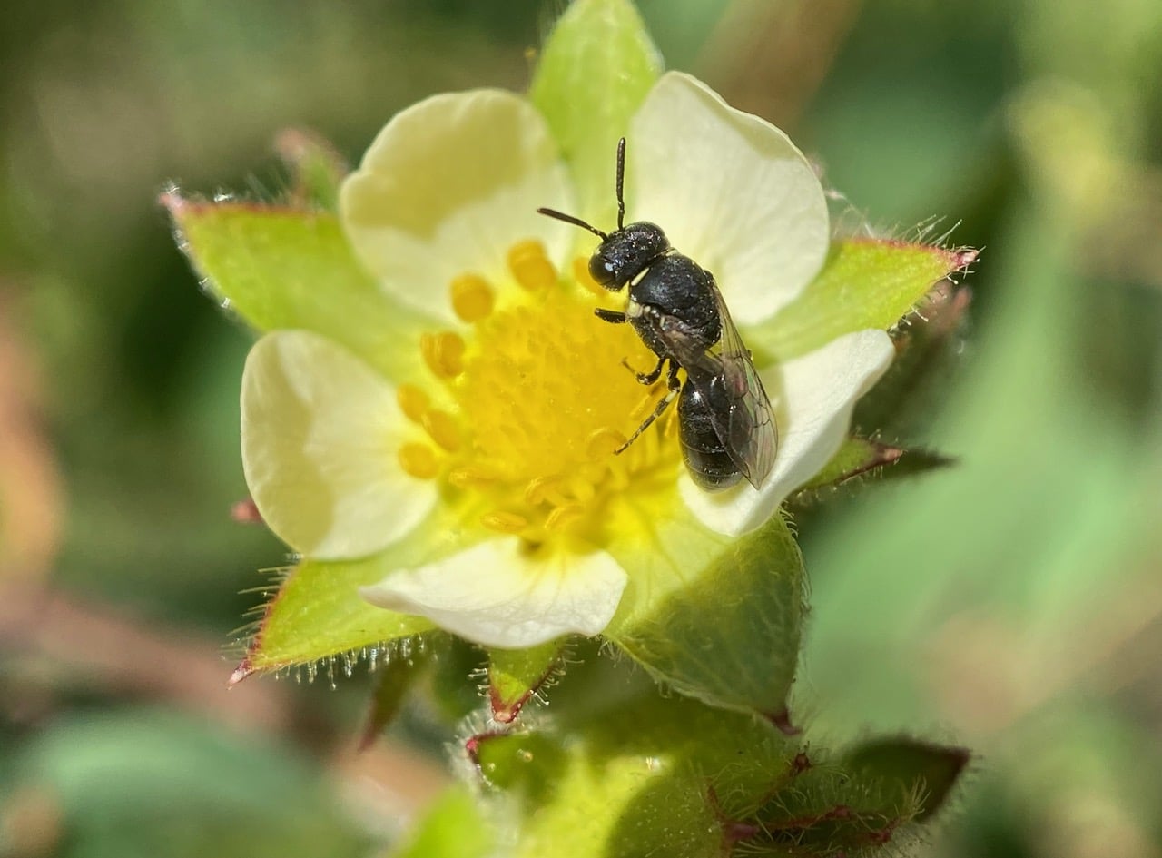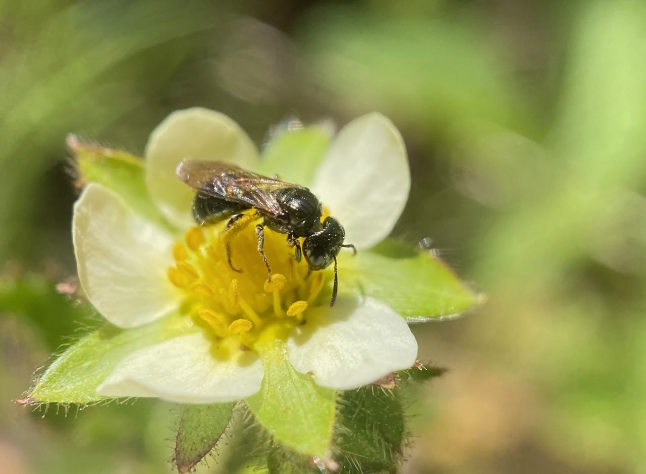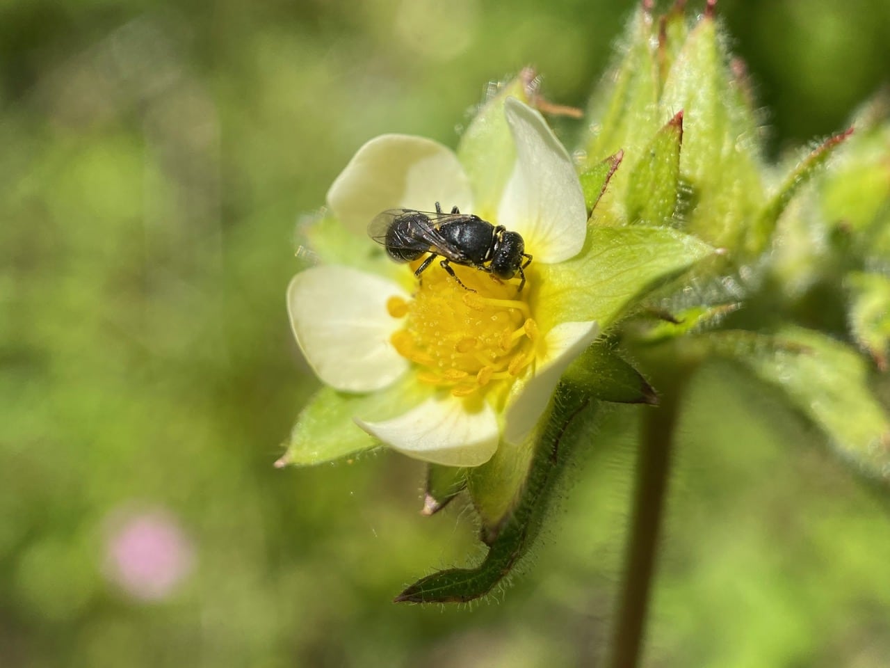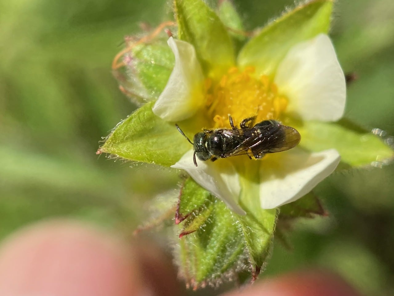 By far the most common bee visiting the Sticky Cinquefoil flowers is the Small Carpenter Bees, Ceratina sp. (family Apidae).