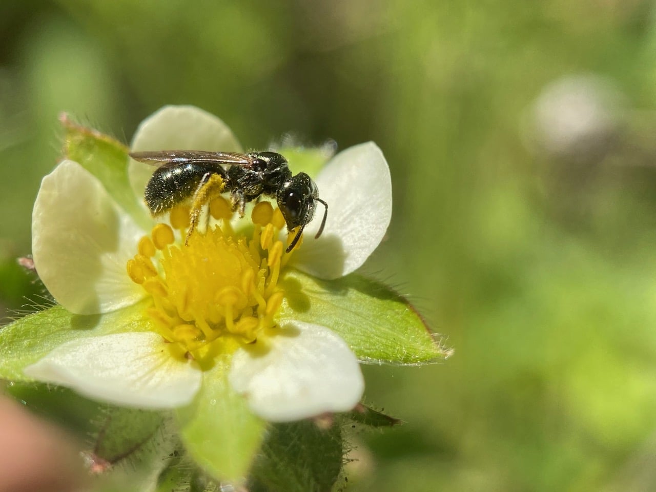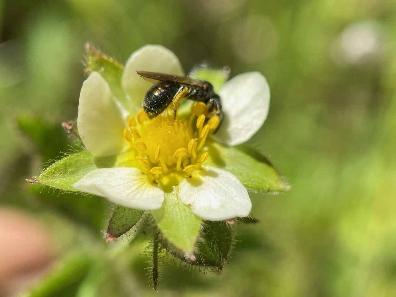 A tiny bee, about the size of a grain of rice is foraging on a flower of Sticky Cinquefoil.