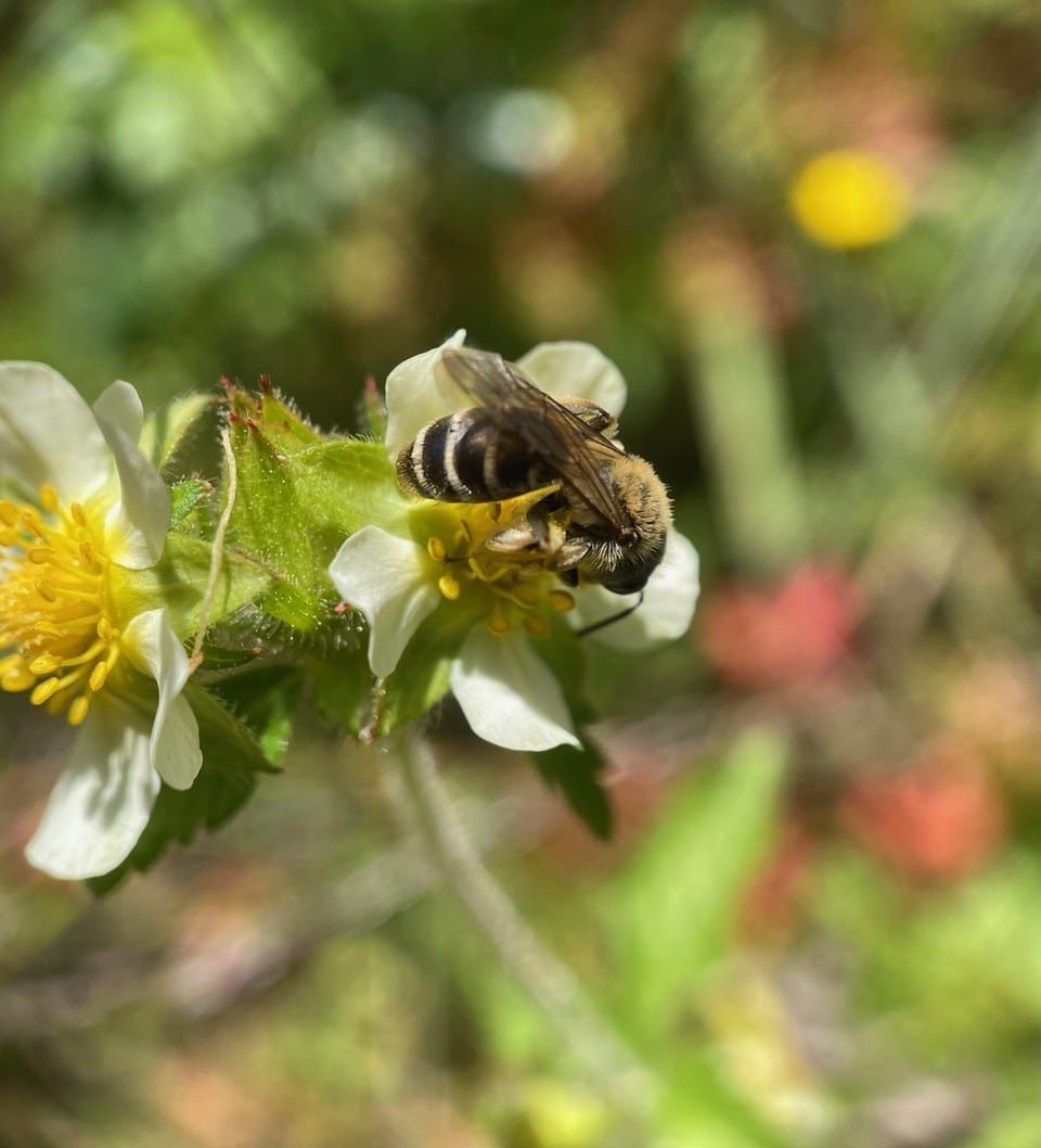 The bee with a long, black-and-white abdomen has empty scopae on her hind legs. She is just beginning to collect pollen on a flower of Sticky Cinquefoil, Drymocallis glandulosa.
