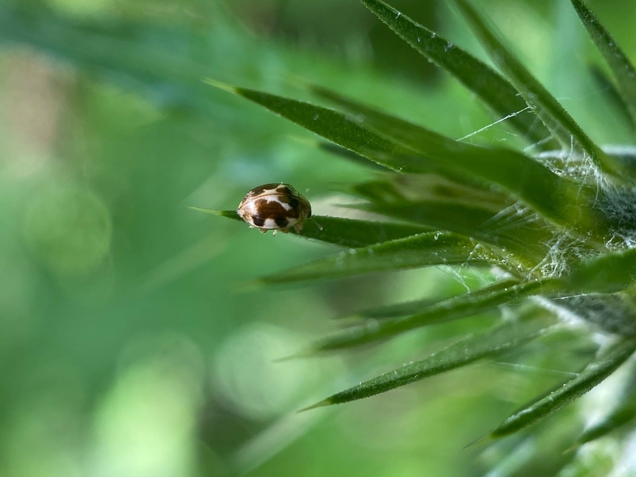 Only 2-3 mm in length, a Twenty-spotted Lady Beetle is resting on a sharp phyllary of an Italian Thistle.