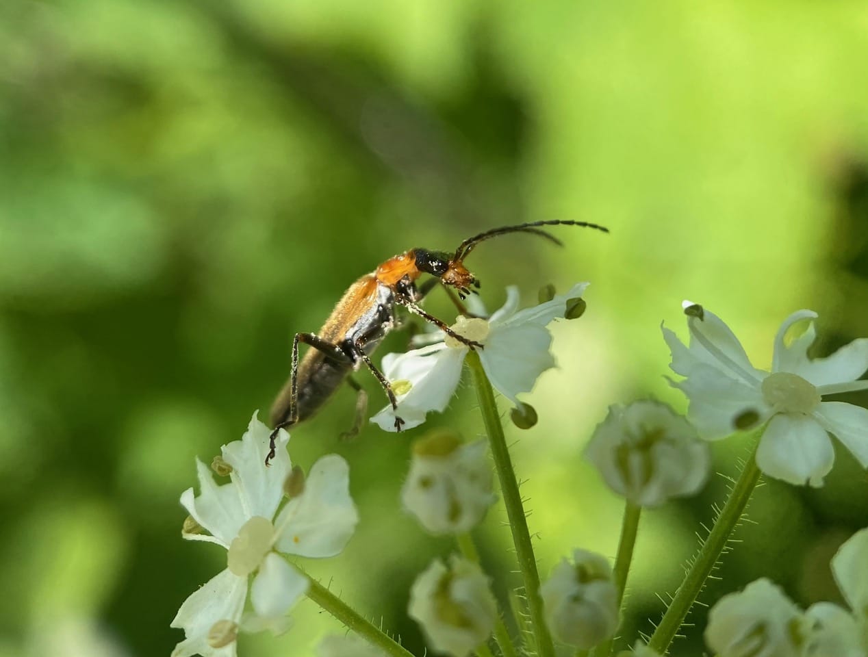 In the dappled shade, a Soldier Beetle, Dichelotarsus cavicollis (family Cantharidae), (formerly Podabrus cavicollis) is feeding on something on an umbel of Cow Parsnip flowers, Heracleum maximum. What interesting mouthparts! Beetles have chewing mouthparts.