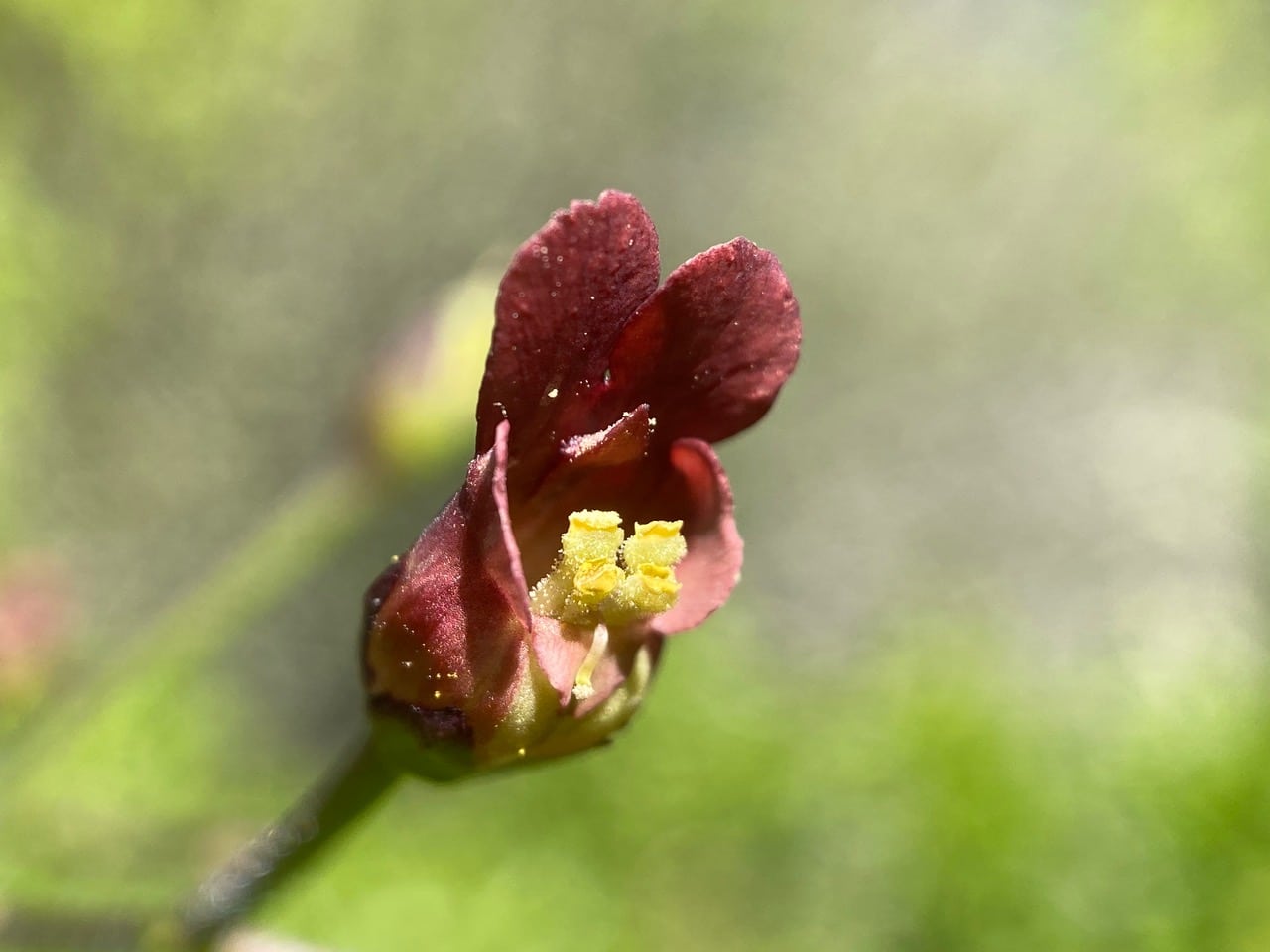 The protogynous flowers of Bee Plant, Scrophularia californica in this northern section of Skyline Trail are finally entering their male phase, with their stamens rolled out of the throat of the flower, offering pollen to any insect that stops by. The style with the stigma has retired out of the way, lying against the lower lip of the flower.