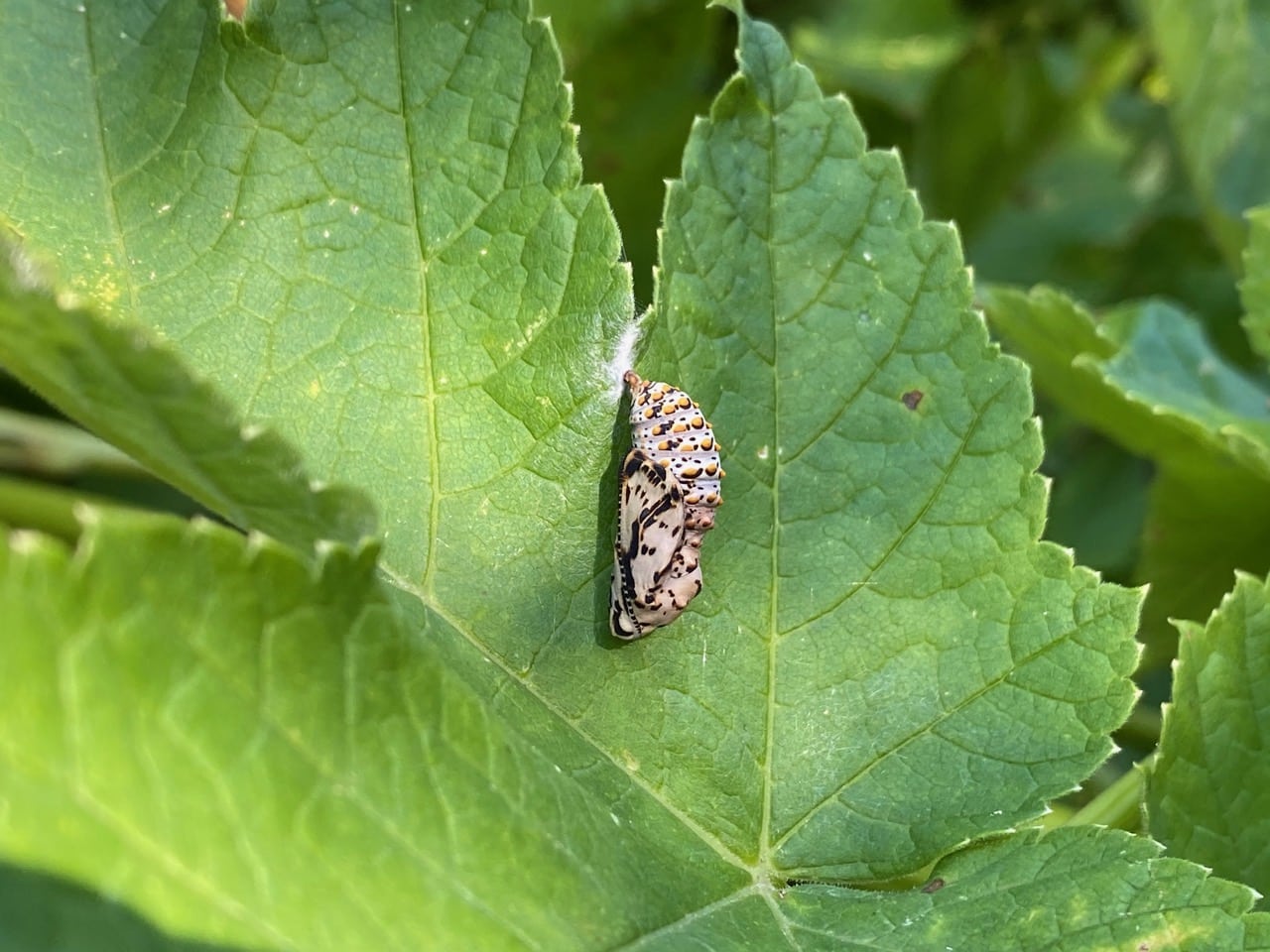 Excited to check on the Variable Checkerspot chrysalis on the Cow Parsnip leaf that I found on 4/30, I am disheartened to find the plant lying prone across the trail. What happened? Of all the Cow Parsnip along the trail, why this one? The chrysalis is still there but if someone comes to clear the trail, it might be removed along with the plant.