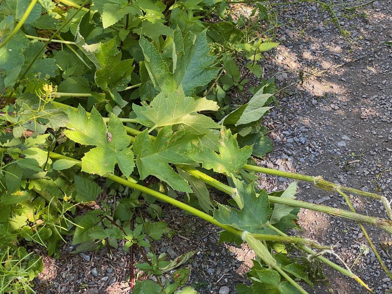 The chrysalis looks OK, getting a little darker around the thorax area. I do my best to prop up the plant against adjacent Cow Parsnips, and wish the butterfly the best of luck. The caterpillar has not chosen well when it went scouting for a pupation site.