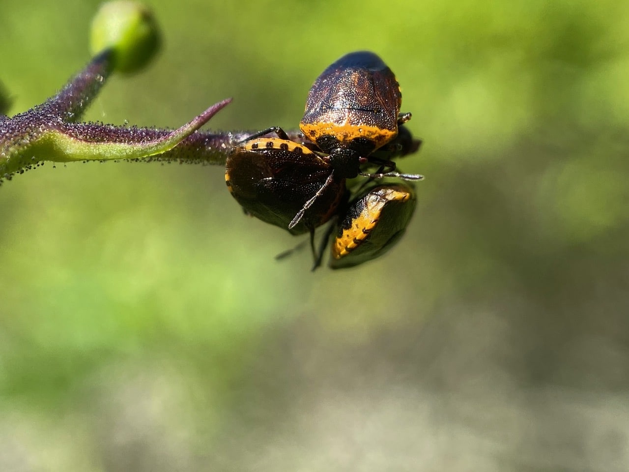 Three little Stink Bugs, Cosmopepla uhleri (family Pentatomidae) are clustered on a flower bud of Bee Plant, Scrophularia californica.