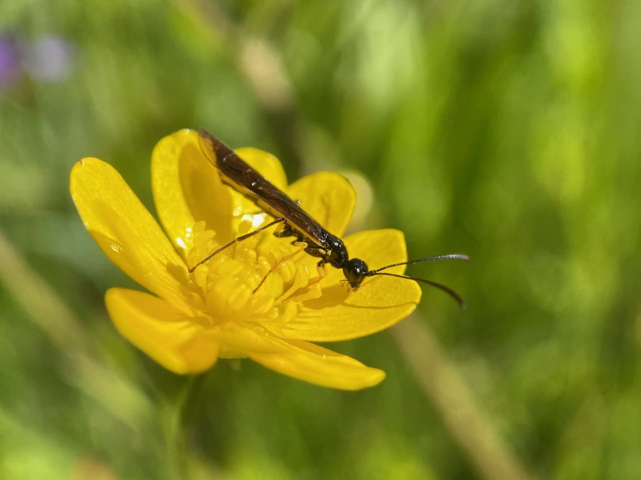 I am glad that the Click Beetles are no longer on the buttercups – their feeding can be quite destructive to the flowers. A Stem Sawfly, Calameuta sp.(family Cephidae) has found itself a nice fresh buttercup flower.