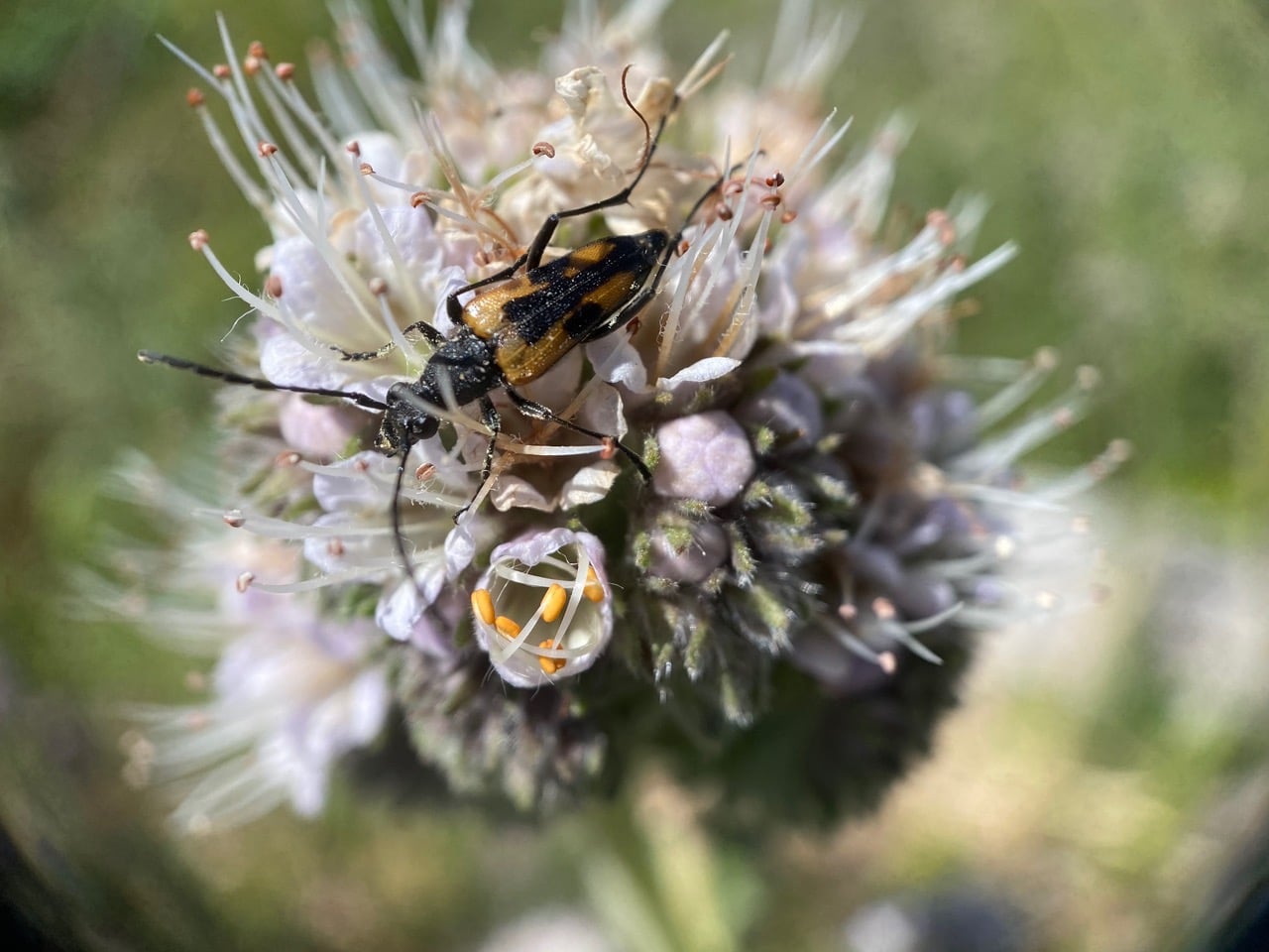 Waiting for my ride at Sieta Gate, I find this male Dimorphic Flower Longhorn Beetle, Anastrangalia laetifica (family Cerambycidae, subfamily Lepturinae) on an inflorescence of California Phacelia, Phacelia californica.